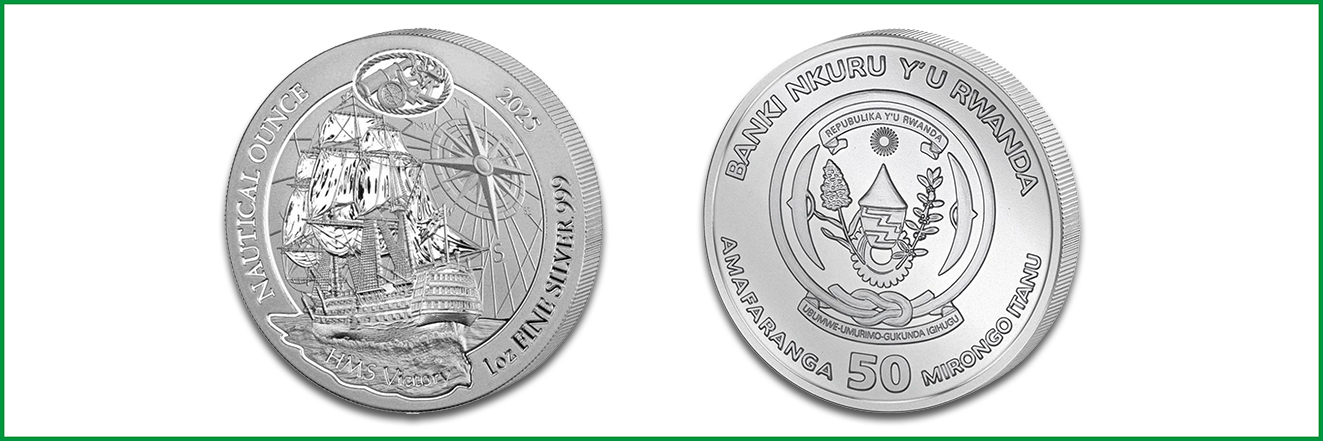 Die Silbermünzserie »Nautical Ounce« wurde erstmals 2017 für die Republik Ruanda ausgegeben. Es handelt sich um eine Agenturmünze, die von verschiedenen Münzprägestätten produziert wird. Sie zeigt auf ihrer Rückseite bedeutende historische Schiffe, die über die Weltmeere gefahren sind. Das Motiv für 2025 präsentiert die HMS Victory. Das dreimastige Linienschiff wurde Anfang der 1760er-Jahre für die Royal Navy gebaut. Das Flaggschiff von Vizeadmiral Nelson wurde durch die Seeschlacht von Trafalgar 1805 bekannt. Das Motiv zeigt die Victory voll aufgetakelt und in voller Fahrt auf dem Wasser. Klassische Symbole der Serie sind ein Kompass und weitere nautische Instrumente. Als Umschrift sind Münzname, Feindaten und Jahrgang auf dem Revers integriert. Die Wertseite mit dem Nennwert in Ruanda-Franc (RWF) zeigt das Landeswappen von Ruanda.