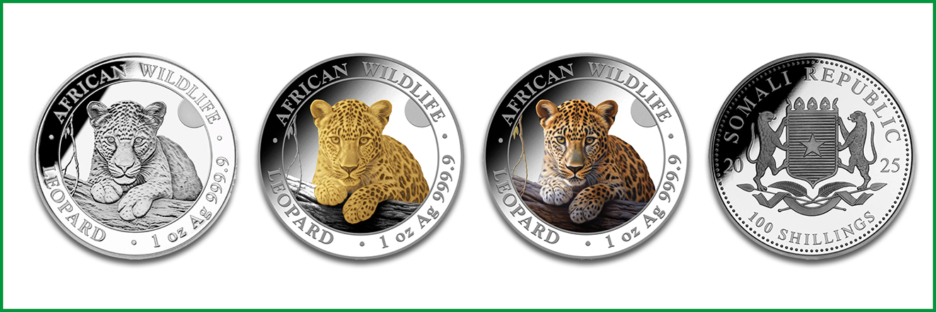 Für die Republik Somalia wird seit 2018 die Agenturmünze »African Wildlife Leopard« produziert. Die achte Ausgabe mit dem Jahrgang 2025 präsentiert einen afrikanischen Leoparden, der in einem Baum sitzt. Im Hintergrund ist die Sonne zu sehen. Das lebendige Motiv ist von einem ringförmigen Außenbereich abgegrenzt, der den Münznamen und die Feindaten des Edelmetalls als Umschrift enthält. Die Vorderseite ist dem Staatswappen der Somalischen Republik gewidmet. Ergänzt sind die Jahreszahl und der Nennwert in Somalia-Schilling (SOS).
