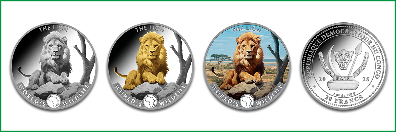 Eine weitere Agenturausgabe erscheint mit der Münzserie »World’s Wildlife«, die erstmals 2019 erschien. Sie ist den Wildtieren dieser Welt gewidmet. Das Motiv für 2025 zeigt einen majestätischen Löwen, der sich auf einem Felsvorsprung niedergelassen hat. Im Hintergrund ist die afrikanische Landschaft (nur in der Farbversion) und ein abgestorbener Baum zu sehen. Den Münzboden bildet der Serienname zusammen mit dem Grundriss des afrikanischen Kontinents. Über dem Löwenkopf schwebt der Münzname »THE LION«. Die Wertseite bildet das Wappen der Demokratischen Republik Kongo mit dem Nennwert in Kongo-Franc (CDF) und den Feindaten ab.