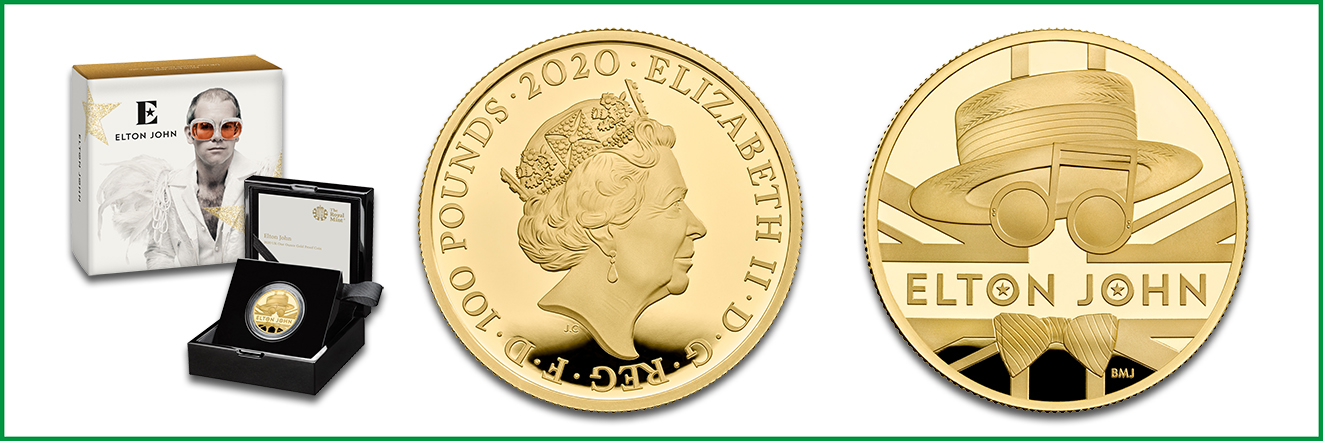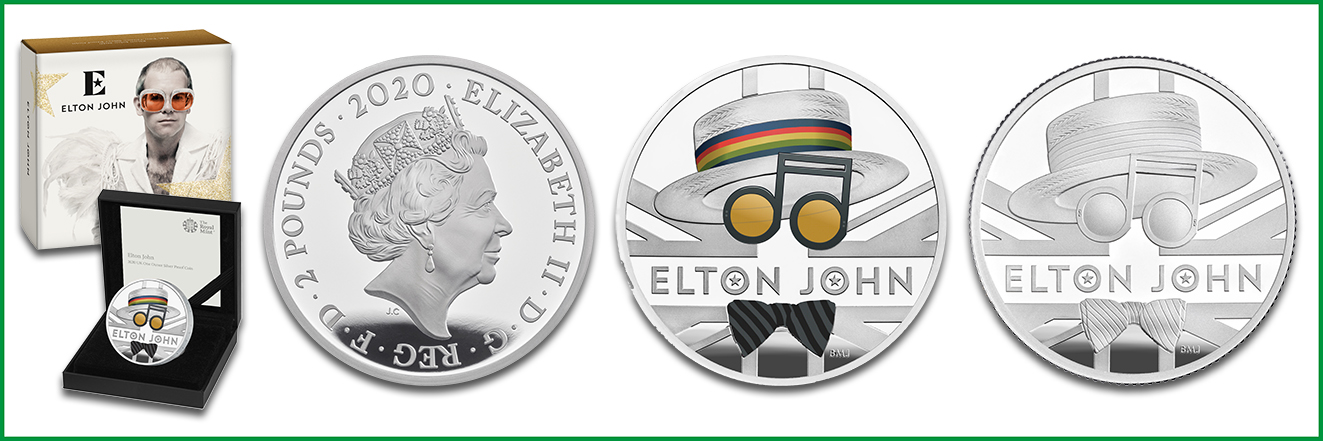 Die britische Royal Mint setzte dem Ausnahmekünstler ebenfalls ein Denkmal. Die Münzserie Music Legends würdigt alljährlich herausragende Musiker und Komponisten. Der Jahrgang 2021 war Elton John gewidmet. Das Rückseitenmotiv von Bradley Morgan Johnson (BMJ) zeigt die ikonischen Accessoires des Künstlers: breitkrempiger Strohhut, markante Brille in Notenform und Fliege vor der britischen Flagge.