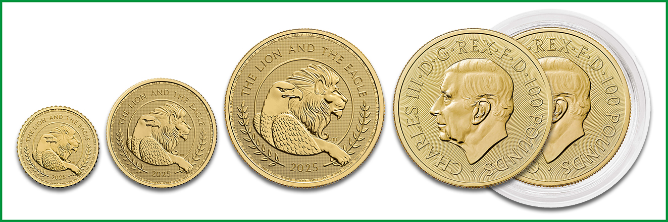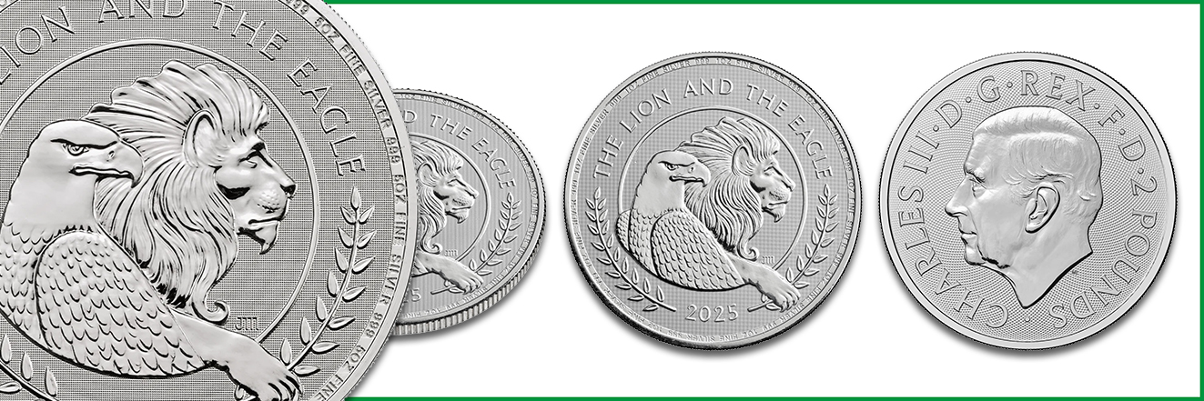 | The Lion And the Eagle 2025 | 1/10 oz Goldmünze | 1/4 oz Goldmünze | 1 oz Goldmünze | 1 oz Silbermünze | 5 oz Silbermünze |