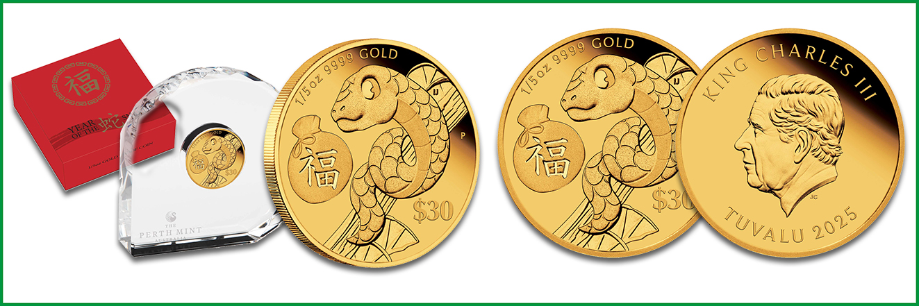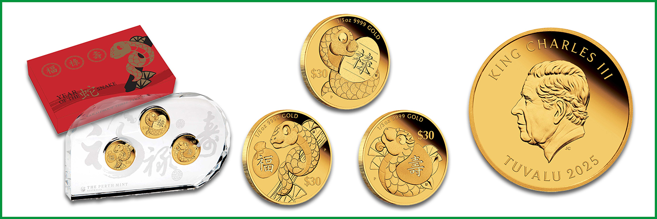 Im chinesischen Jahr der Schlange präsentiert die australische Prägestätte Perth Mint die Chinese Astrological Series 2025. Dabei handelt es sich um Goldmünzen mit unterschiedlichen Schlangenmotiven, die Prosperity (Wohlstand), Longevity (Langlebigkeit) und Success (Erfolg) symbolisieren. Als erstes erscheint das Motiv Prosperity nach einem Design von Ing Ing Jong, das eine Schlange zeigt, die sich um einen Ast windet. Sie bewacht einen Glücksbeutel mit dem chinesischen Schriftzeichen für Wohlstand. Dieser steht für die Anhäufung von Reichtum und soll finanzielles Wachstum und Glück bringen. Auf dem Avers ist King Charles III. nach einem Entwurf von Jody Clark abgebildet.