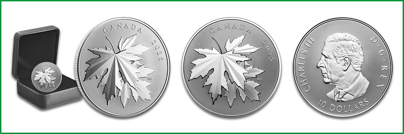Mit einer besonderen Kreation huldigt die Royal Canadian Mint das kanadische Wahrzeichen: die Blätter des Silberahornbaums. Im Sonnenlicht zeigen die Ahornblätter ihre silberne Unterseite. Das Münzdesign von Michelle Grant hat das schimmernde Naturschauspiel durch präzise abgewinkelte Linien eingefangen, die das auftretende Licht getreu dem Original reflektieren und in verschiedene Richtungen streuen. Um den Effekt zu verstärken, wurde als Prägequalität Polierte Platte für die Bildseite ausgewählt, während der Avers mit King Charles III. von Steven Rosati in mattem Stempelglanz erscheint.