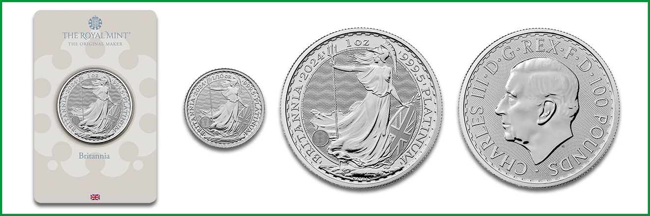 Mit einiger Zeitverzögerung wird ab Januar 2025 auch die Platinmünze Britannia mit dem neuen Jahrgang erscheinen. Erhältlich ist sie dann in den beiden Stückelungen zu 1/10 und 1 Unze. Da die Erstausgabe der Platin-Britannia erst ab 2018 aufgelegt wurde, belief sich der Feingehalt direkt auf dem bis heute typischen Wert von 999,5 Tausendstel. Präsentiert wird die ausschließlich erhältliche Bullionmünze in der Acrylkapsel oder im thematischen Blister mit Echtheitszertifikat. Ebenso wird eine 10er-Tube (1 oz) angeboten.