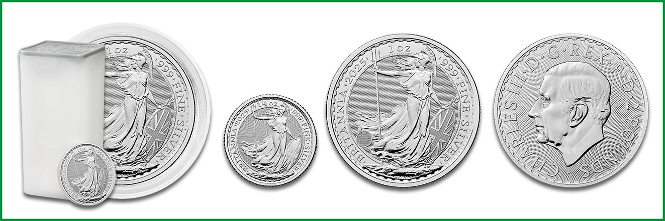 Die Silbermünze Britannia in Bullionqualität wird ebenfalls in den vier Einheiten zu 1/10, 1/4, 1/2 und 1 Unze im Handel erhältlich sein. Für den Jahrgang 2025 stehen aktuell die Größen 1/4 und 1 Unze zur Verfügung, die restlichen Stückelungen erscheinen später. Weitere Einheiten sind auf Polierter Platte als limitierte Editionen verfügbar. Ebenso wie bei der Goldausgabe wurde ab 2013 auch der Silberfeingehalt von 958,7 auf 999/1000 erhöht. Das Britannia-Silber ist einzeln gekapselt oder in der 25er-Tube (1 oz) sowie als Masterbox mit 20 Tuben erhältlich.
