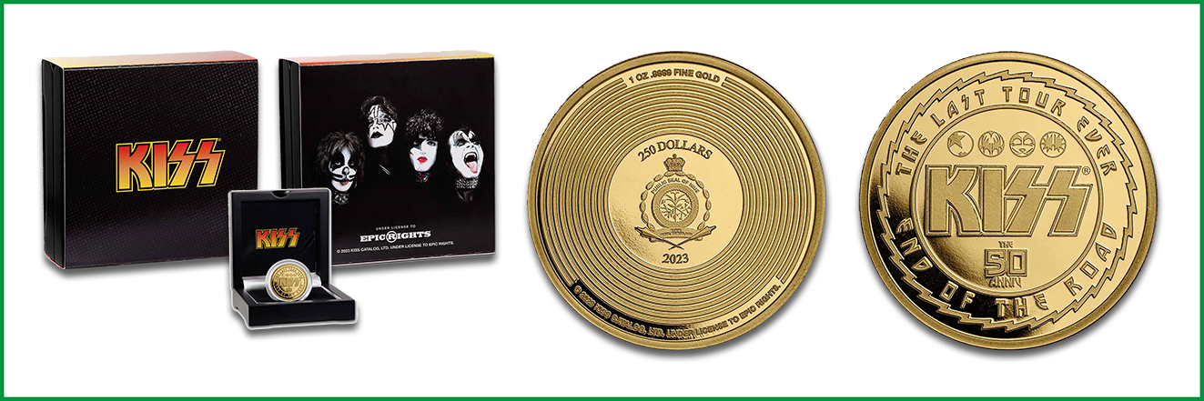 Die US-amerikanische Hardrock-Band KISS feiert in diesem Jahr ihr 50-jähriges Jubiläum. Sie wurde 1973 in New York gegründet. Aus diesem Ereignis erscheint eine weitere Agenturausgabe für den südpazifischen Staat Niue. Dabei liegen zwei unterschiedliche Designs zugrunde. Die Rückseiten der Gold- und Silbermünzen ziert das ikonische KISS-Logo. Die vier Gründungsmitglieder The Starchild, The Demon, The Catman und The Spaceman sind symbolhaft dargestellt. Die Umschrift integriert die beiden Schriftzüge »The Last Tour Ever» und »End Of The Road«, welche die Abschiedstournee 2023 markieren. Die Vorderseite zeigt das markante Rillendesign einer Vinyl-Schallplatte mit dem Niue-Landeswappen im Zentrum. Dort sind ebenfalls Nennwert und Erscheinungsjahr aufgeprägt.