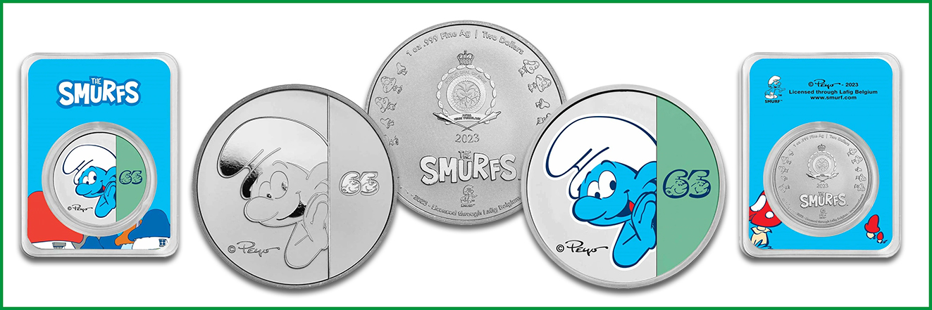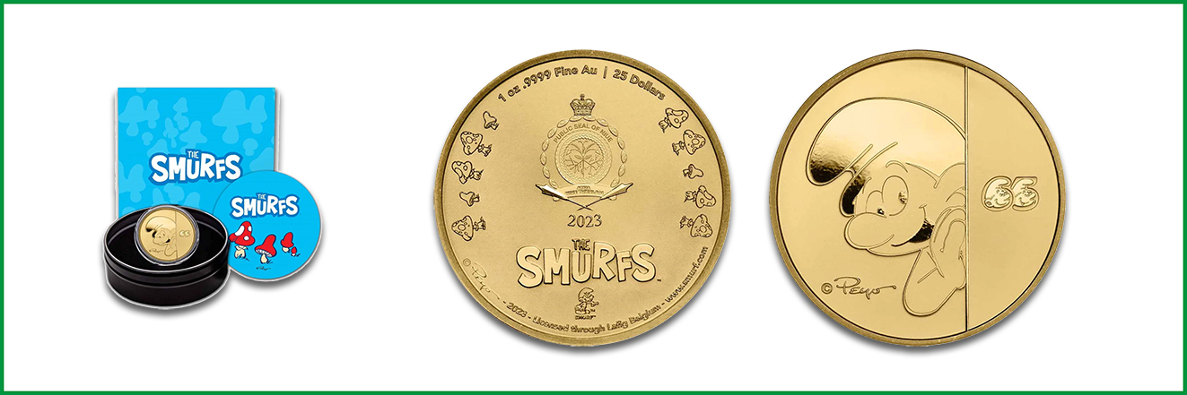 Die Schlümpfe erschienen erstmals 1958 in Belgien als Comic-Heft. Seither entstanden viele weitere Abenteuer als Bücher, Spielfilme, TV-Serie, Musikstücke und unzählige Merchandise-Artikel. In diesem Jahr feiern die blau-weißen Figuren ihren 65. Geburtstag. Aus diesem Anlass erscheint die Agenturausgabe »65 Years The Smurfs« für den neuseeländischen Inselstaat Niue. Die Lizenzmünze ist in Gold, Silber und als Silberfarbmünze jeweils zu einer Unze erhältlich.