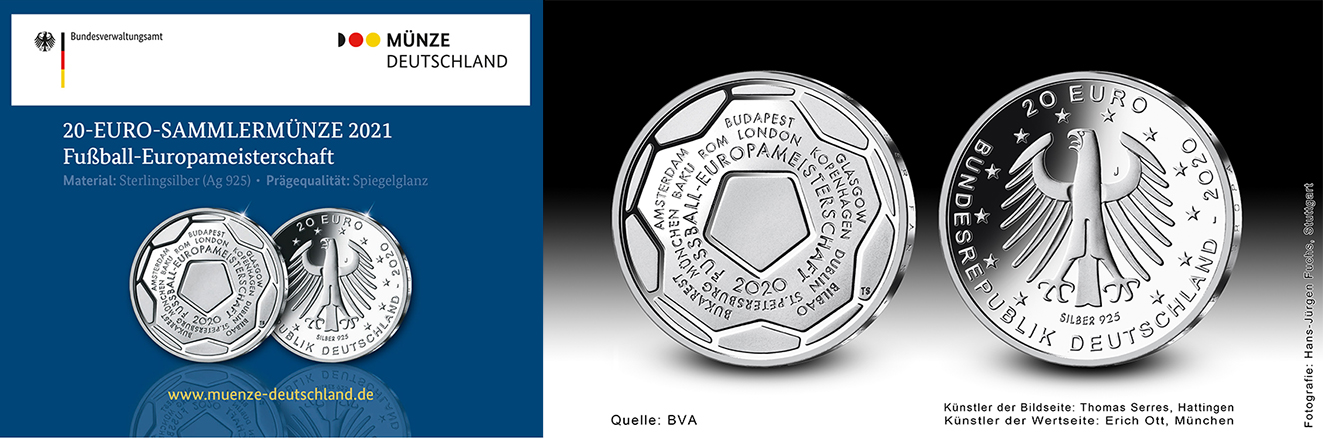 Erhältlich ist die EM-Silbermünze einzeln in der Münztasche, im thematischen Schuber sowie in der Tube zu 25 Stück. Ihre Auflage umfasst bis zu 120.000 Exemplare in Spiegelglanz und 1.200.000 Stück in Stempelglanz. Im Oktober erscheint sie zudem als »20-Euro-Sammlermünzen-Set 2021« gemeinsam mit den Motiven: Frau Holle, 50 Jahre Sendung mit der Maus, 100. Geburtstag Sophie Scholl und 200. Geburtstag Sebastian Kneipp, die auch einzeln verfügbar sind.