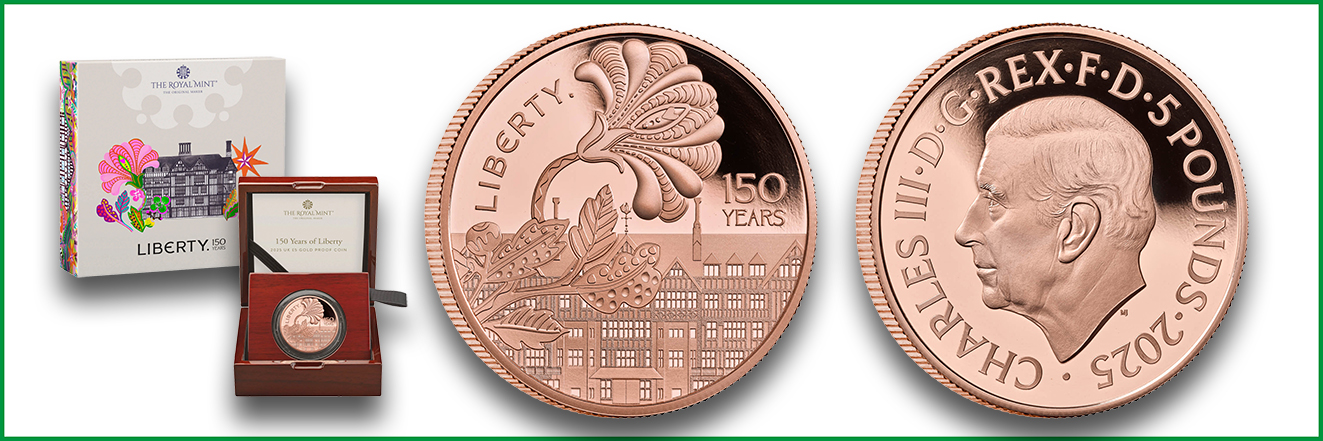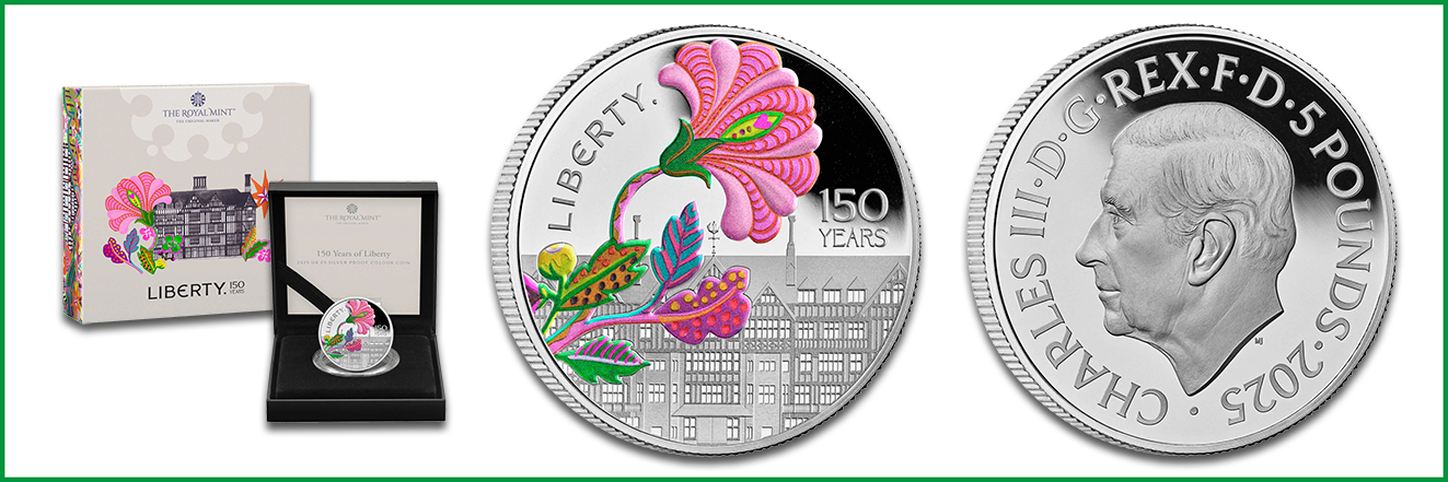 Das Modehaus Liberty in London zählt zu den bekanntesten Geschäftshäusern der Welt. Sein markantes Gebäude wurde vom Königshaus Tudor inspiriert. Jetzt feiert es sein 150. Jubiläum. Aus diesem Anlass veröffentlicht die britische Royal Mint eine limitierte Sonderauflage mit dem Abbild des Wahrzeichens auf der Rückseite. Kunstvolle Blüten schmücken das Motiv, das vom Liberty Design Team entwickelt wurde. Auf der Wertseite ist das Abbild von King Charles III. nach Martin Jennings inklusive Titel und Nennwert in Britische Pfund zu sehen.