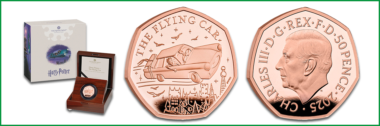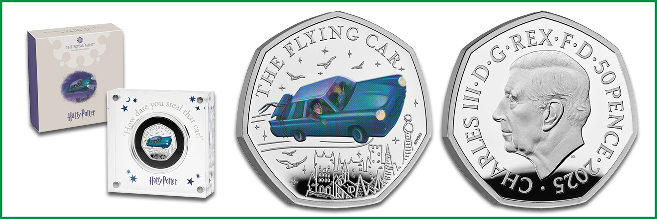 Aus der Harry Potter-Serie gibt die Royal Mint ein neues Motiv mit dem Namen »The Flying Car« heraus. Das Rückseitendesign von Bella Biggs ist einer Szene aus Harry Potter und die Kammer des Schreckens nachempfunden. Es zeigt den Zauberlehrling sowie seinen Freund Ron Weasley am Steuer eines fliegenden Ford Anglia. Am unteren Bildrand ist die Hogwarts Schule für Hexerei und Zauberei zu sehen. Das Motiv wurde in Zusammenarbeit mit Warner Bros. Discovery Global Consumer Products erstellt. Der Avers zeigt King Charles III. nach Martin Jennings inklusive des Nennwerts.
