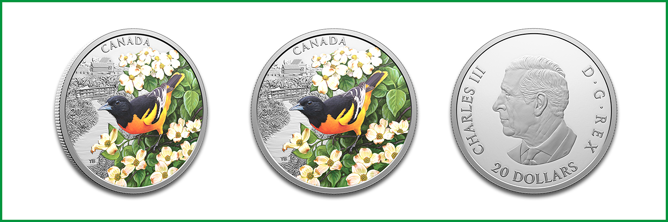 Aus der Reihe der farbenfrohen Vögel erscheint mit der »Baltimore Oriole« die fünfte Ausgabe mit dem Jahrgang für 2025. Der kanadische Pirol besticht durch sein leuchtend orangefarbenes Gefieder. Er sitzt in einem Hartriegelbaum und ist umgeben von Blüten. Im Hintergrund ist eine ländliche Gegend im Süden Kanadas mit einen Bachlauf und Holzbrücke zu sehen. Entworfen wurde das Motiv von Tony Bianco (TB). Das Vorderseitenmotiv von Steven Rosati zeigt King Charles III. zusammen mit dem Nennwert über 20 Kanadische Dollar.