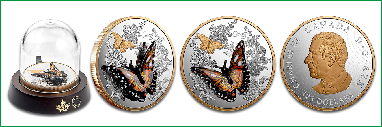 Ein besonderes Highlight für Sammler stellt die extravagante Silbermünze »Murano Monarch Butterfly« der Royal Canadian Mint dar. Die Halb-Kilo-Münze besteht aus 999,9 Tausendstel Silber und weist vergoldete Elemente auf. So erscheinen das Effigy auf dem Avers, der kleine Schmetterling auf der Bildseite sowie der geriffelte Rand mit einer Echtgoldauflage. Für einen Blickfang sorgt der Monarchfalter, der aus handgefertigtem Muranoglas aus Italien besteht. Die aufgesetzte Figur spiegelt sich auf der glänzenden Oberfläche der Silbermünze, sodass ein Doppeleffekt entsteht. Für den botanischen Hintergrund ließ sich Gestalterin Caren Heine (CN) von einem Originalgemälde inspirieren. Der Jahrgang 2025 ist harmonisch in das Design integriert. Die Wertseite mit dem vergoldeten Portrait von King Charles III. nach einem Entwurf von Steven Rosati bezieht den Nennwert über 125 Kanadische Dollar (CAD) ein.