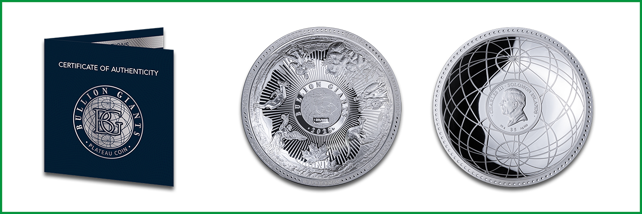Die Silbermünze »Bullion Giants« zu 50 Gramm vereint sieben beliebte Edelmetallmotive wie Ahornblatt, Känguru, Springbock, Siegesgöttin oder Pandabär vor einem Strahlenhintergrund. Auf dem Rand befinden sich die Namen der Motive. Der Avers zeigt eine stilistische Weltkugel mit dem Effigy von King Charles III. im Zentrum. Die Münze wurde von der Royal Canadian Mint speziell für den deutschen Markt hergestellt. Herausgegeben wird die Agenturausgabe für die südpazifische Inselgruppe Salomonen mit einem Nennwert über 5 Salomonen-Dollar (SBD).