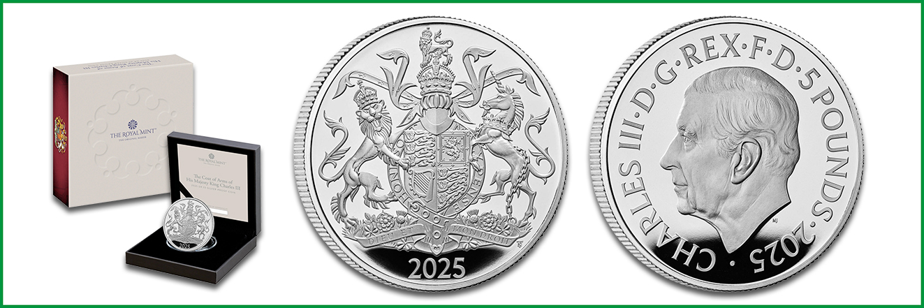 Mit der Silbermünze »The Coat of Arms« (nicht zu verwechseln mit der Serie Coat of Arms der RAM) bringt die Royal Mint erstmals das neue Wappenmotiv von King Charles III. in einem Münzdesign heraus. Entwickelt wurde es von Timothy Noad (TN). Zu sehen ist die Tudor-Krone auf dem königlichen Schild, das von Löwe und Einhorn flankiert wird. Im Münzboden ist der Jahrgang 2025 integriert. Der Avers bildet das Portrailrelief des Wappenträgers von Martin Jennings ab mit Titel und Nennwert über 5 Britische Pfund (GBP).