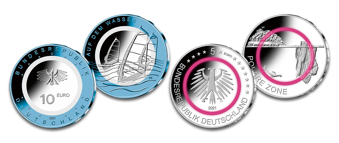 © Münze Deutschland: Silbermünzen mit Polymerring »Auf dem Wasser« Künstler: Daniel Engelberg (Bildseite), Andres Witting (Wertseite) »Polare Zone« Künstlerinnen: Natalie Tekampe (Bildseite), Stefanie Radtke (Wertseite)