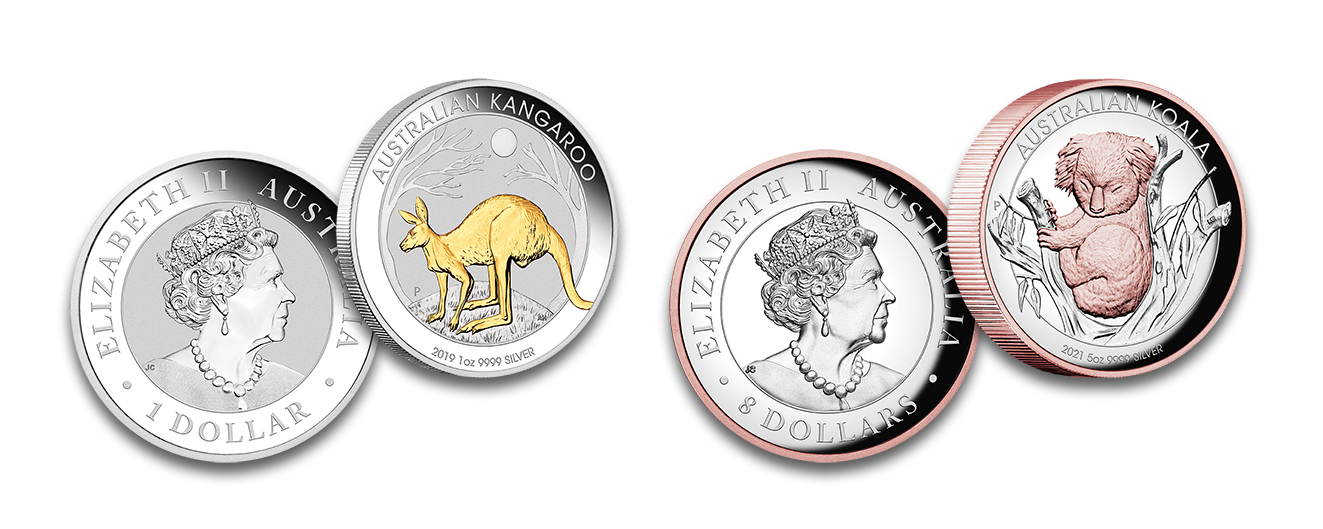 © Perth Mint: Vergoldete Silbermünzen: Australian Kangagroo 2019 mit Gelbgold und Australian Koala 2021 Hochreliefmünze zu 5 oz mit Motiv und Rand aus Roségold.