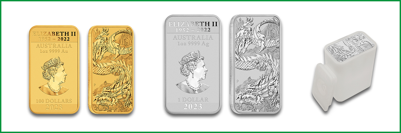 Mit etwas Verspätung ist nun auch das neue Design der rechteckigen Bullionmünze Dragon Rectangular für den Jahrgang 2023 erschienen. Auf der Bildseite präsentiert die australische Perth Mint ein markantes Drachenmotiv, dass von Wade Robinson entworfen wurde. Im Hintergrund des Fabelwesens sind Statuen und Ikonen alter Zivilisationen zu erkennen, die es bewacht. Die Wertseite stellt das Emblem Queen Elizabeth II. dar, das von Jody Clark entwickelt wurde. In dieser Memorial-Version sind außer den Münzdaten ebenfalls die Regentschaftsjahre der Commonwealth-Monarchin von 1952 bis 2022 integriert. Verfügbar ist das Design als Dragon Rectanglular Gold und Dragon Rectanglular Silber jeweils zu 1 Unze.