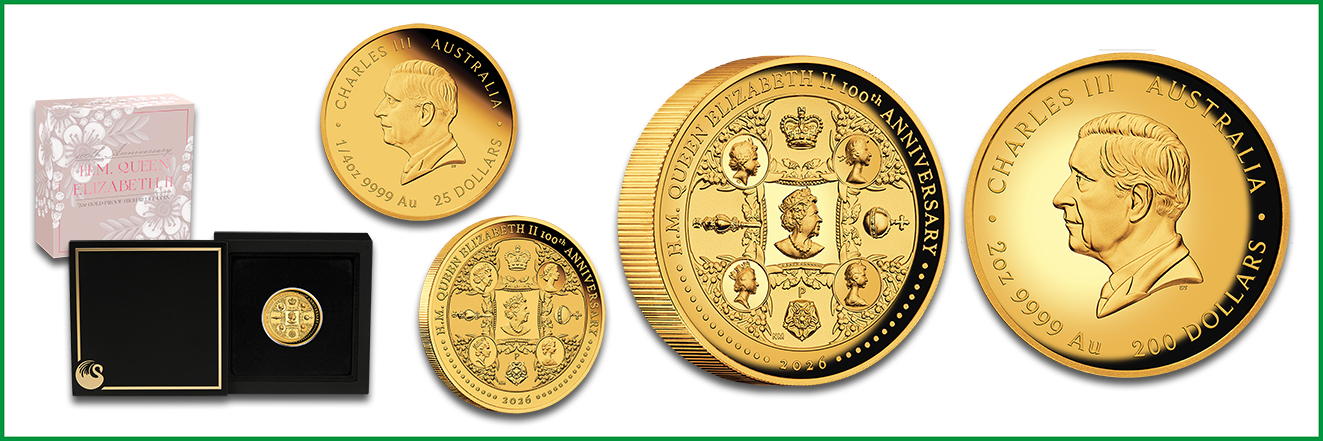 Zu den Jubiläums-Ausgaben gehört eine Goldmünze, die auf ihrer Rückseite fünf unterschiedliche »Effigies« darstellt. Dabei handelt es sich um die Bildnisse der Queen, die über sieben Jahrzehnte die Wertseiten australischer Münzen im Wandel der Zeit zierten. Im Zentrum befindet sich die jüngste Abbildung des Künstlers Jody Clark aus 2019. Darum sind die früheren Portraits der Königin von Ian Rank-Broadley (1998), Raphael Maklouf (1985), Arnold Machin (1966) sowie das erste Relief von Mary Gillick aus 1953 gruppiert. Den Hintergrund bildet die Goldakazie, das Blumenwappen Australiens, mit St.-Ewards-Krone, Reichsapfel, Zepter und Tudor-Rose. Das 100. Jubiläum von Queen Elizabeth ist als rahmengebende Umschrift in das Design von Natasha Muhl integriert.