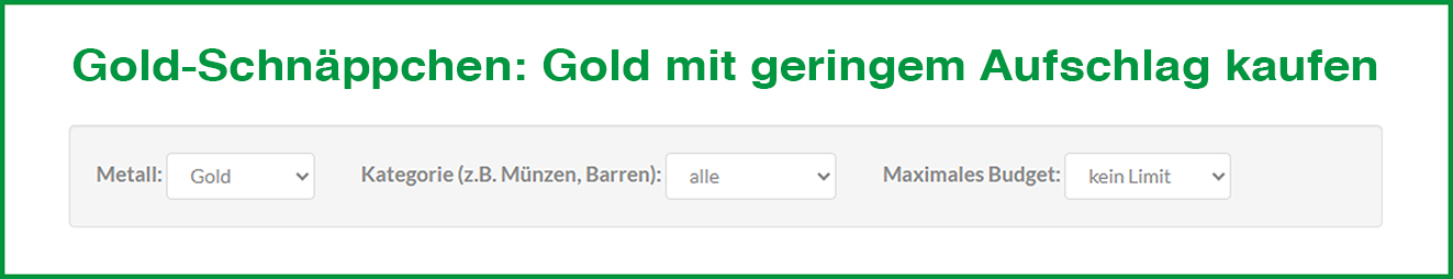 Klicken Sie dazu auf die folgende Grafik, um zwischen den Metallen Gold, Silber, Platin oder Palladium zu wechseln. Sie können auch eine Kategorie wählen und ein Budget festlegen. Angezeigt werden Ihnen die Angebote mit den geringsten Aufschlägen pro Gramm. Der Sammlerwert hat jedoch keinen Einfluss auf die Auswahl.