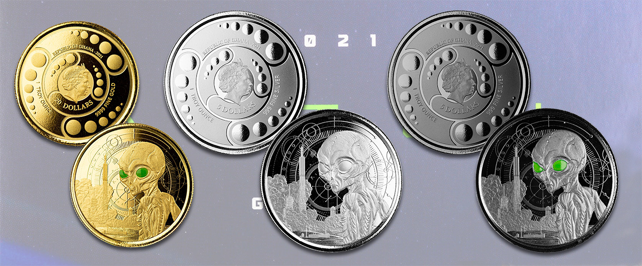 | Ghana Alien | 1 oz Gold Proof-Color | 1 oz Silber Proof-Color | 1 oz Silber BU | 1 oz Silber Antik-Finish | 1 oz Silber Rhodium-Plat. |