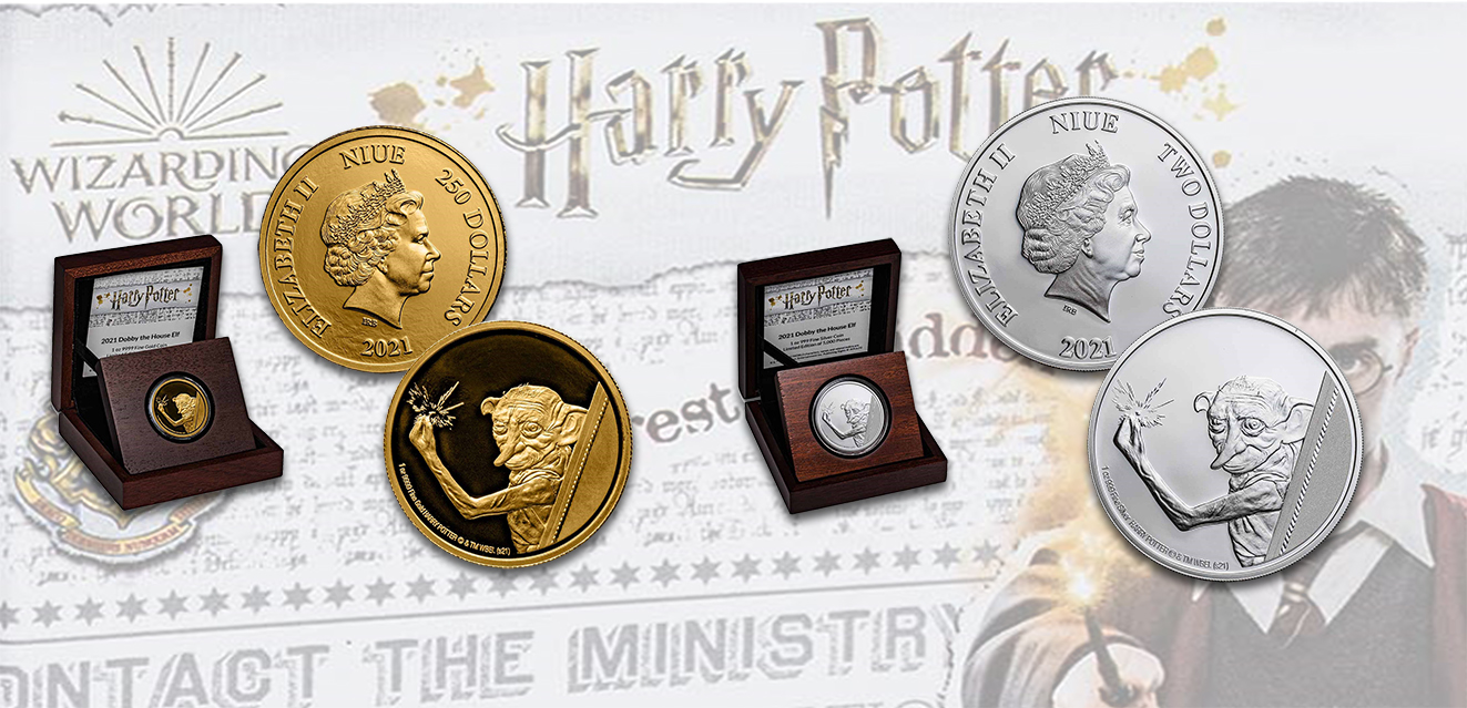 Aus der Harry Potter-Serie erscheint mit der 2021er Ausgabe das neue Motiv »Dobby the House Elf«. Das Design ist als Goldmünze zu 1/4 und zu 1 Unze erhältlich sowie als Silbermünze zu einer Unze. Beide Edelmetalle sind auf Polierter Platte geprägt und in limitierter Auflage verfügbar. Herausgeber ist die New Zealand Mint für den Inselstaat Niue im Südpazifik. Daher ist der Nennwert in Neuseeland-Dollar (NZD) angegeben.