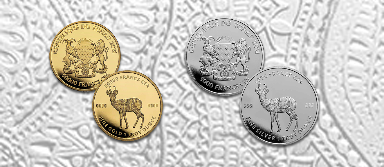 Die noch junge Münzreihe Mandala Chad erscheint seit 2018 als Gold- und Silberausgabe. Sie wird von der Sunshine Mint geprägt und offiziell von der Republik Tschad in Afrika ausgegeben. Erhältlich ist sie jeweils in der Einheit zu 1 Unze. Pro Jahrgang erscheinen ein bis zwei unterschiedliche Motive, welche der Tierwelt Afrikas gewidmet sind. Nach Löwe und Nashorn (2018), Elefant (2019) sowie Flusspferd und Büffel (2020) folgt nun das Thema Antilope. Das Horntier weist eine kunstvolle Fellzeichnung auf, wie für diese Serie üblich. Der Revers bildet außerdem die Feindaten der Münze ab sowie den Nennwert in CFA-Franc.