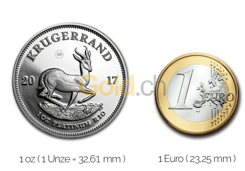 Größenvergleich Krügerrand Platinmünze mit 1 Euro-Stück