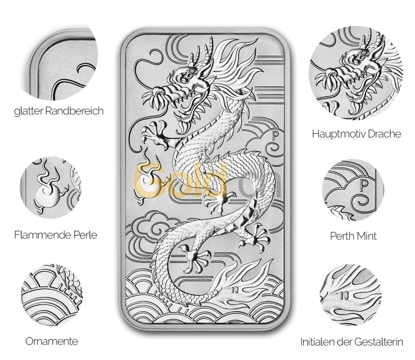 Der Münzbarren „Dragon Rectangular“ ist ein ausgezeichnetes Beispiel für eine gelungene Motivdarstellung, inspiriert durch die erfolgreichen fernöstlichen Motive der australischen Münzserie im Namen des Mondes (Australian Lunar Coin Series). Der Drache ist ein himmlisches Wesen und wird mit dem Mond in Verbindung gesetzt.