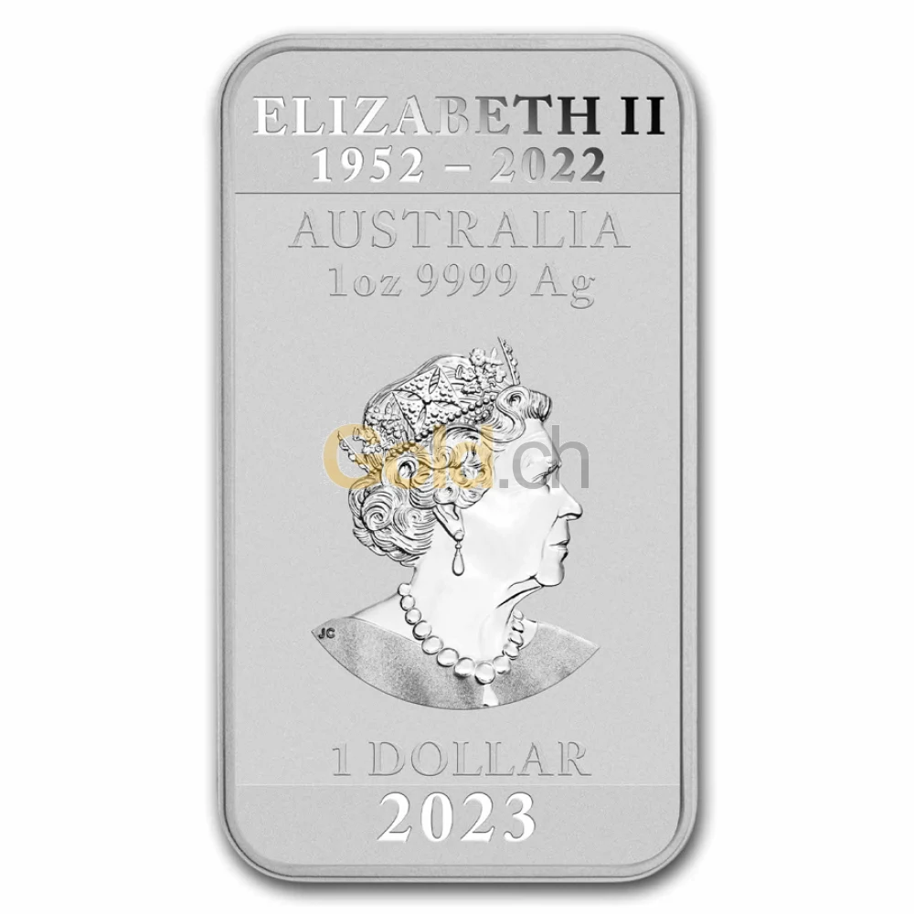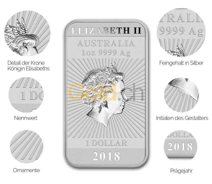 Auf der Vorderseite schmückt das strahlende vierte Porträt Königin Elisabeth II. den Münzbarren, welches auf allen Münzen des Vereinigten Englands und Commonwealths bis ins Jahr 2015 geprägt wurde. Das Porträt liegt in der Mitte des Münzbarrens und ist umgeben von glänzenden Strahlen, die radial um den Kopf der Königin angeordnet sind. Über ihrem königlichen Haupt steht „AUSTRALIA 1oz 9999 Ag“ matt auf glänzendem Hintergrund. Am Kopf der rechteckigen Münze ziert „ELIZABETH II“ in glatt polierter Schrift den matten Hintergrund. Unter dem Bildbereich ergänzen „1 DOLLAR“ und „2018“ den Münzbarren.