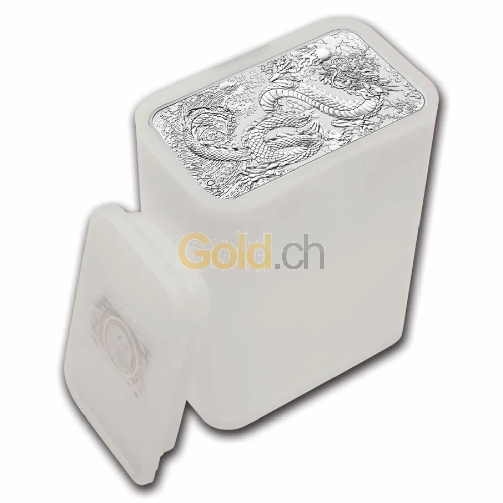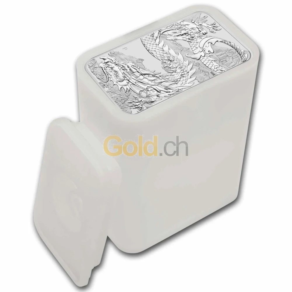 Auf der Rückseite verziert von einem silbernen chinesischen Drachen und auf der vorderen Seite gekrönt von Königin Elizabeth II. Durch ihre einzigartige Form und ihr beeindruckendes Motiv ist sie in jedem Falle eine attraktive Anlage.