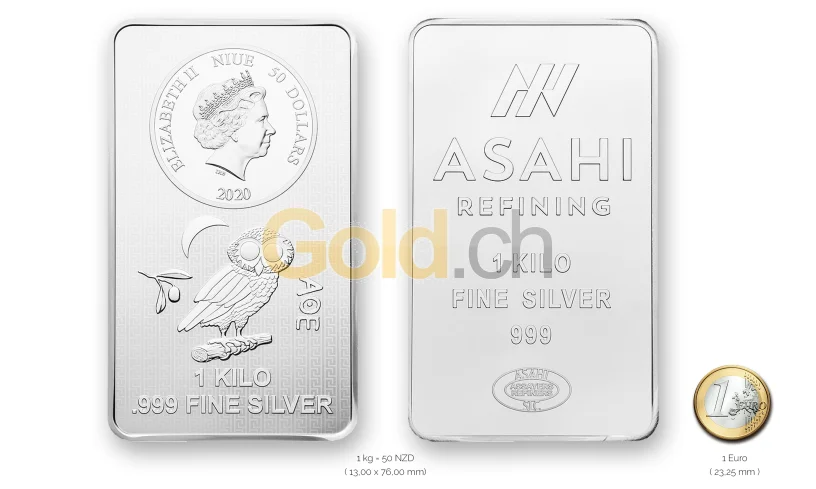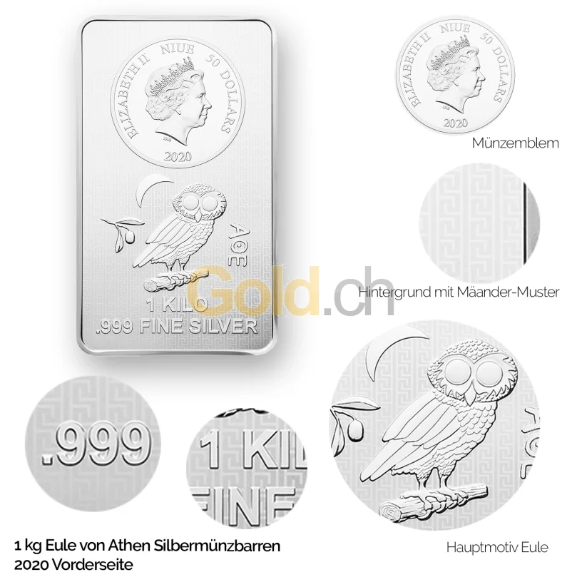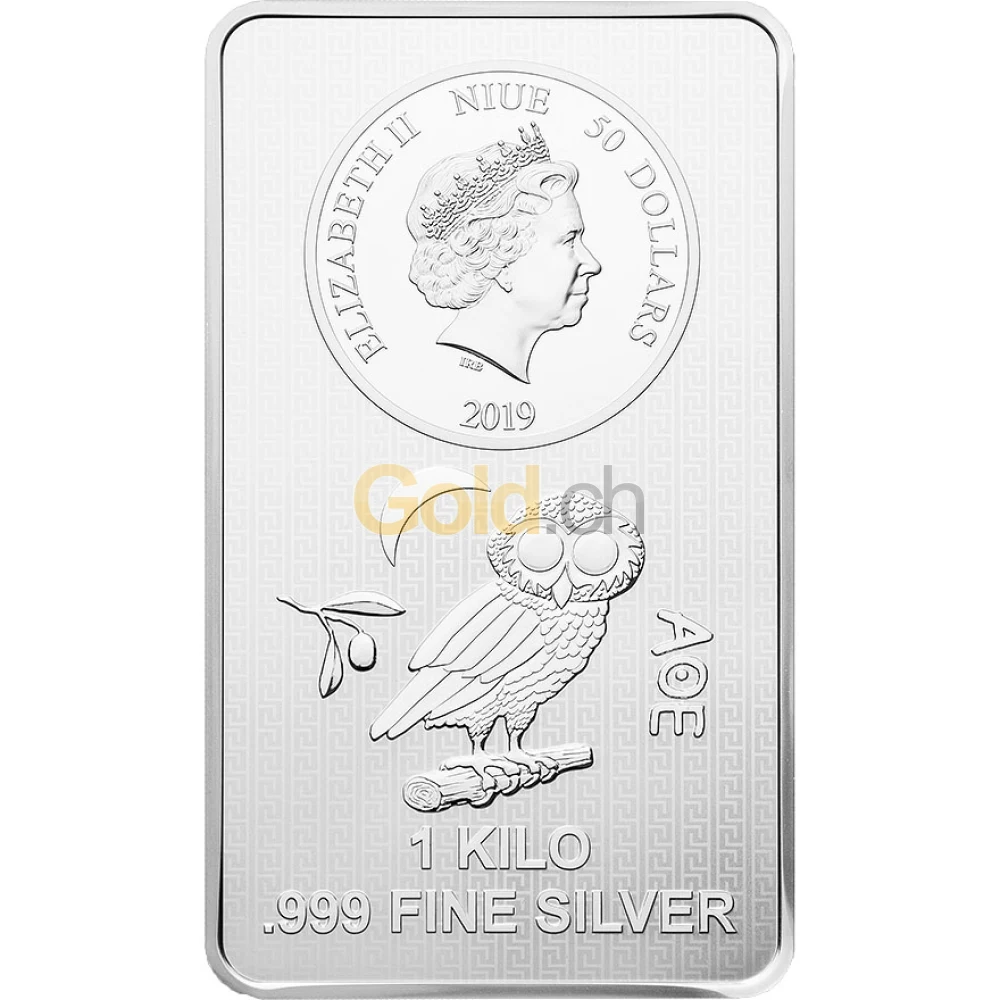 Der Silbermünzbarren »Eule von Athen« oder »Athenian Owl« wird seit 2019 von der Regierung des Inselstaates Niue in jährlich gleichbleibender Optik ausgegeben. Geprägt wird er von der amerikanischen Produktionsstätte Asahi Refining. Auf der Vorderseite des 1 Kilogramm schweren Bullionsilbers befindet sich das historische Eulen-Motiv der attischen Tetradrachme (um 530 v.Chr.) zusammen mit dem offiziellen Münzdesign, welches der Commonwealth-Monarchin Elizabeth II. gewidmet ist. Es integriert den Nennwert über 50 Neuseeland-Dollar, wodurch das Edelmetall gesetzliches Zahlungsmittel ist. Hergestellt ist der 130 x 76 Millimeter große Münzbarren aus reinem Silber mit einer Feinheit von 999 Tausendstel. Als Prägequalität kommt Stempelglanz zum Einsatz. Das legendäre Eulenmotiv findet sich ebenfalls auf der seit 2017 erscheinenden gleichnamigen Silbermünze.