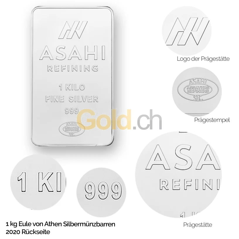 Während die Front des Silbermünzbarrens aufwendig gestaltet ist, zeigt sich die Rückseite eher im schlichten Design. Mit dem charakteristischen Logo und Schriftzug der Asahi Refining wird der LBMA-zertifizierte Hersteller in den Mittelpunkt gerückt. Darunter wiederholen sich die technischen Daten des Edelmetalls von der Vorderseite in anderer Darstellung: »1 KILO FINE SILVER 999«. Seine finale Gestaltung erhält die Seite durch den eingetragenen Raffinerie-Stempel. Ihr Hintergrund erscheint strukturlos.