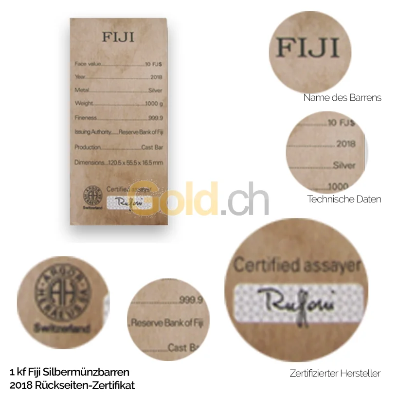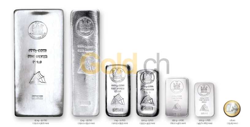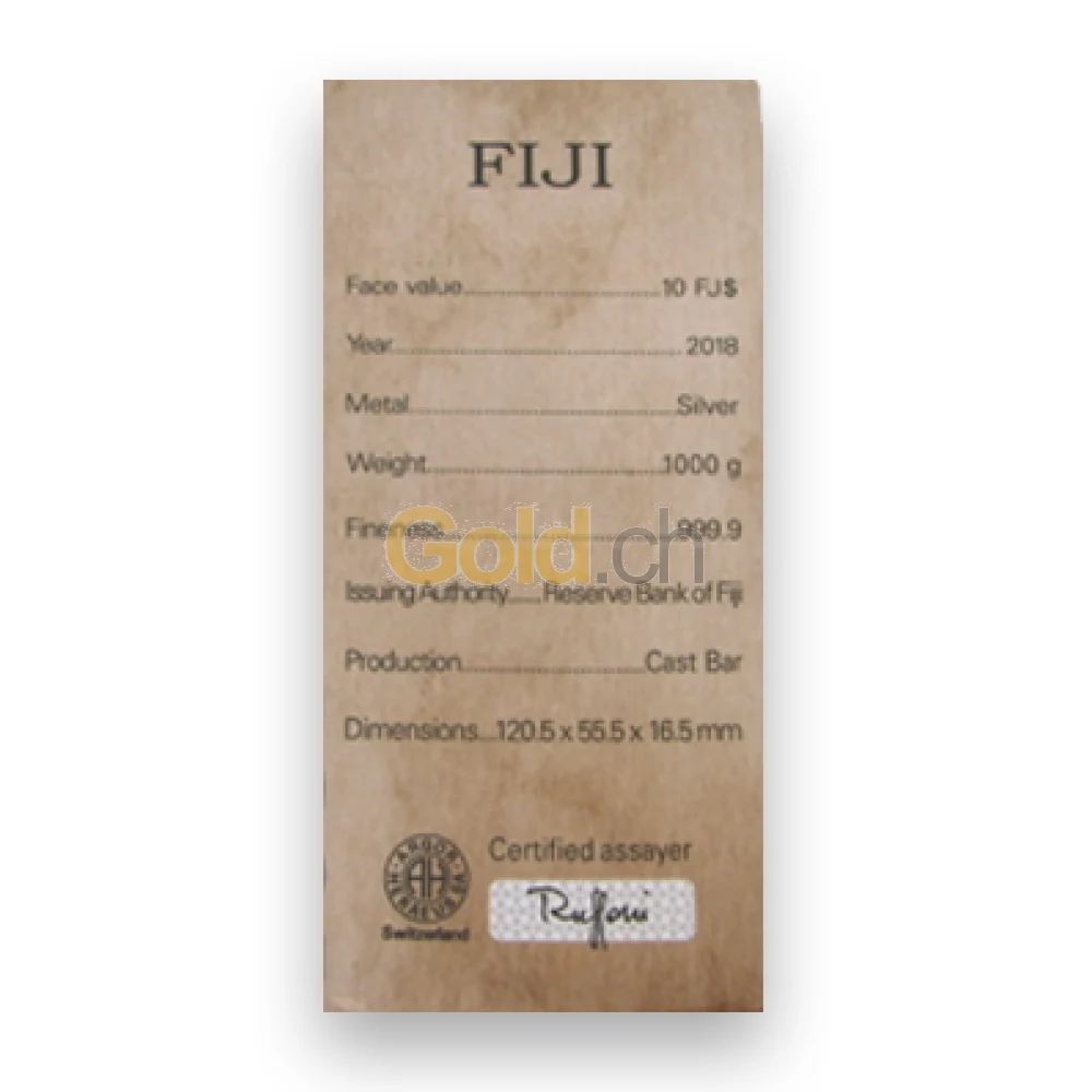 Der Silbermünzbarren Fiji wird seit 2015 in jährlich identischer Aufmachung von der renommierten Schweizer Prägestätte Argor Heraeus produziert und in Lizenz ausgegeben. Lizenzgeber ist die Reserve Bank of Fiji auf den südpazifischen Fidschi-Inseln. Erhältlich ist das Anlagesilber in den Einheiten zu 15, 5 und 1 Kilogramm sowie zu 500, 200 und 100 Gramm. Hergestellt ist es in hoher Feinheit aus 999,9/1000 Silber. Da der Silberbarren über ein eingeprägtes Münzemblem mit Nennwert verfügt, ist er offizielles Zahlungsmittel auf den Fidschis. In Deutschland sowie anderen Ländern, kann er statt des Regelsteuersatzes von 19 Prozent differenzbesteuert erworben werden. Dadurch erhalten Anleger im Gegensatz zu klassischen Barren mehr Silber für ihr Geld.