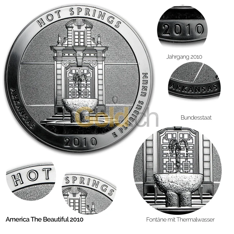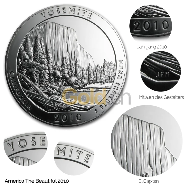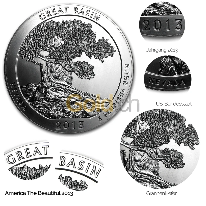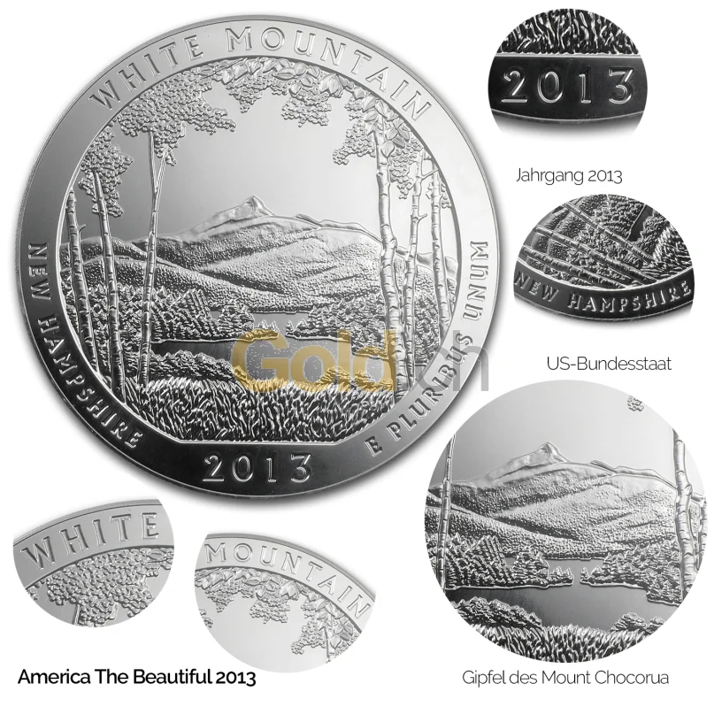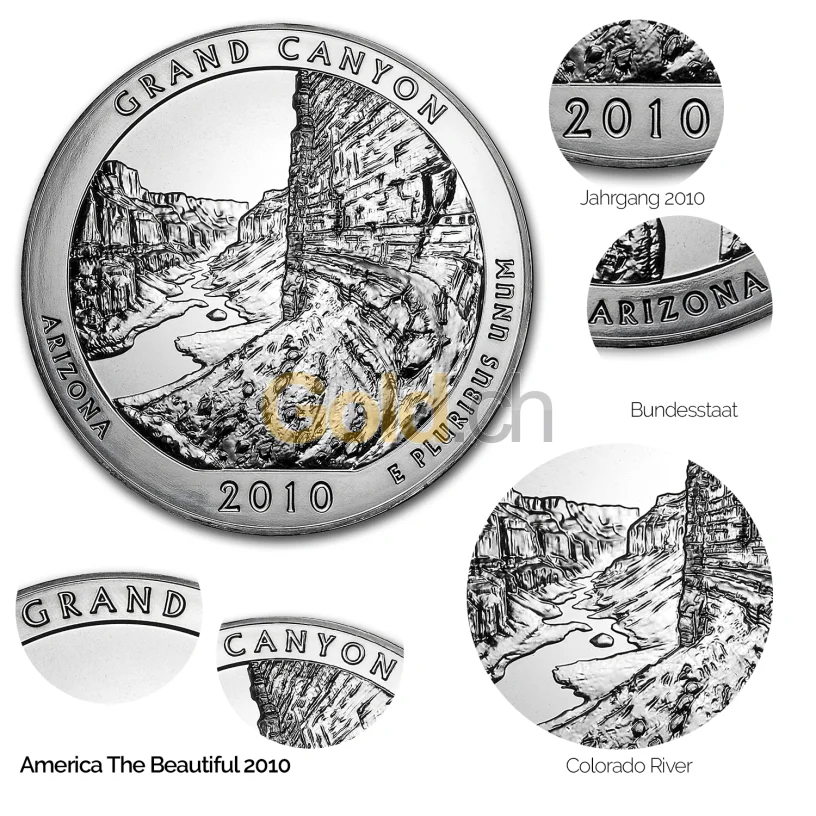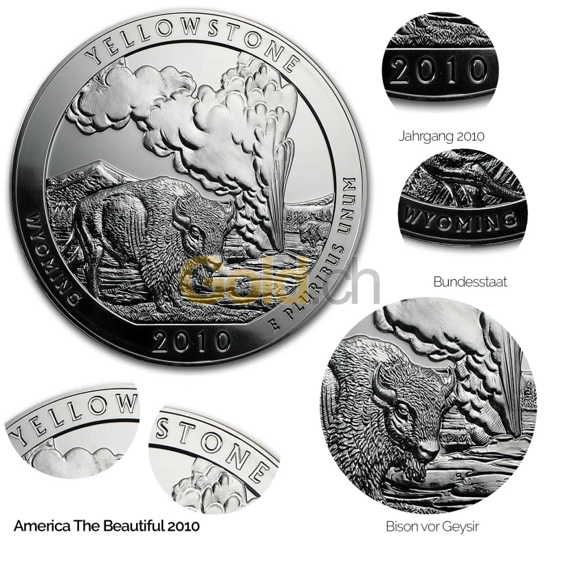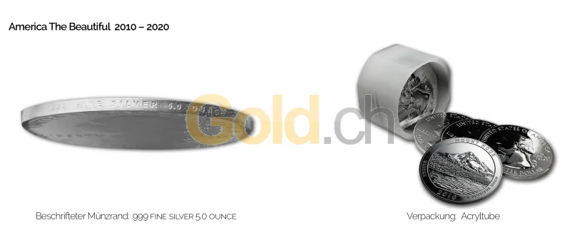 Seit 2010 besteht die eindrucksvolle Serie „America the Beautiful“ (Abk. ATB). Die amerikanische Prägeanstalt „United States Mint“ erweitert sie jährlich um fünf neue Motive. Die Silbermünzen zeigen verschiedene Sehenswürdigkeiten der Vereinigten Staaten Amerikas. Auf der Vorderseite, mit dem Nennwert von einem 1/4 US-Dollar (auch Quarter genannt), ist der Gründervater und die amerikanische Ikone George Washington zu sehen. Neben ihren vielfältigen Motiven beeindruckt die Münzserie durch die stattliche Größe der einzelnen Exemplare von 7,62 cm und einem Feingewicht von 5 Unzen (oz), was 155,5 Gramm Silber entspricht. Der Feingehalt liegt bei 99,9 % Silber. Die Serie der bisher größten Bullion-Silbermünzen, die das Werk der United States Mint verließen, waren im Jahre 2010 auf eine Stückzahl von 33.000 pro Motiv limitiert. Aufgrund ihrer hohen Beliebtheit bei Sammlern und Anlegern wurde die Auflagenzahl im darauffolgenden Jahr auf 126.000 erhöht und sank anschließend wieder stetig. Die umfangreiche Serie „America the Beautiful“ bietet eine Herausforderung für jeden Münzsammler. Daneben dient das hohe Feingewicht der Bullionmünzen als eine besondere Gelegenheit zur Wertanlage.
