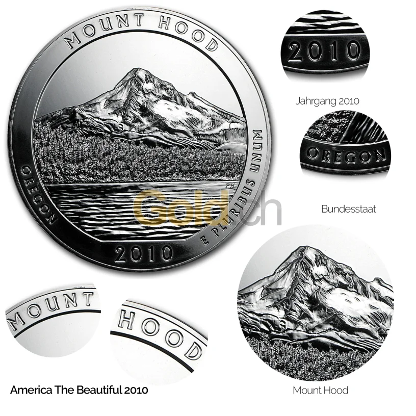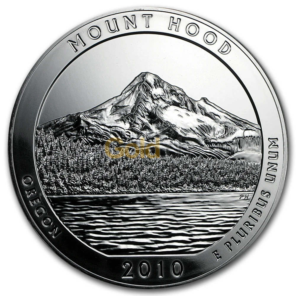 Die Silbermünze „Mount Hood“ zeigt den im Bundesstaat Oregon gelegenen gleichnamigen Berg. Vor der eindrucksvollen Gebirgsspitze im Nordwesten der USA liegt ein weiter Nadelwald. Davor ist einer der vielen Seen der Region abgebildet: der Lost Lake (dt., Verlorener See).