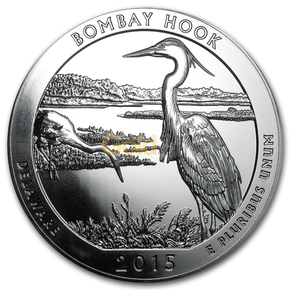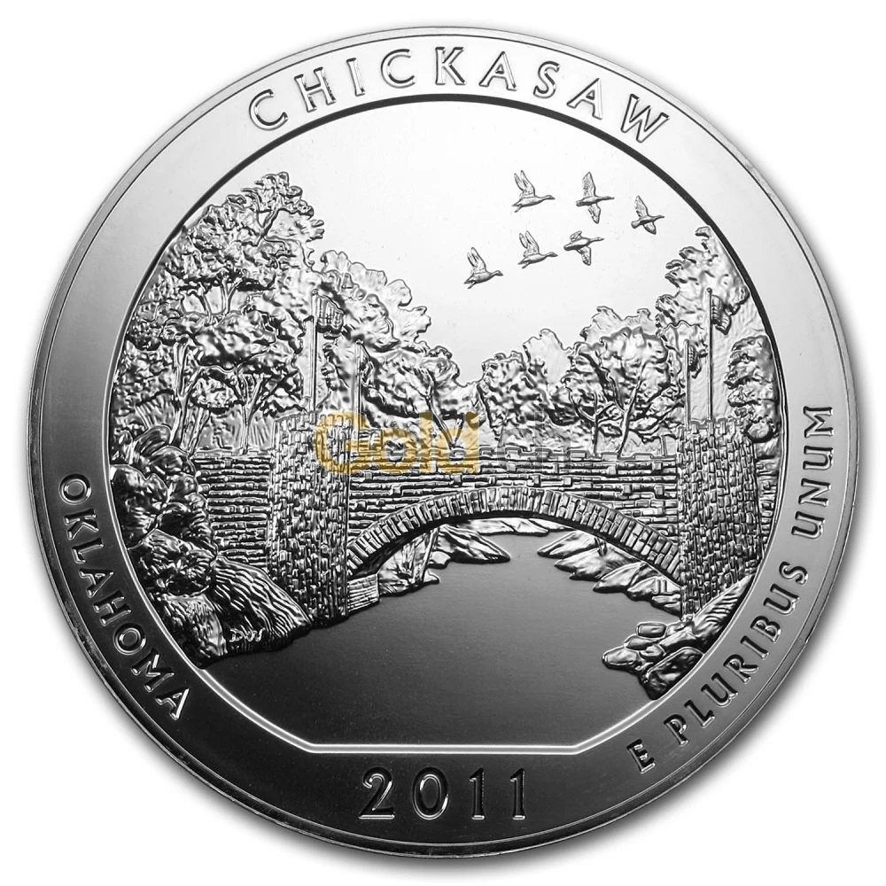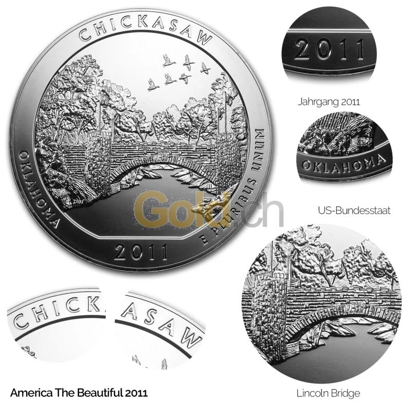Die letzte Silbermünze aus dem Jahre 2011 zeigt die Lincoln Bridge im Chickasaw Nationalpark in Oklahoma. Über die steinige Brücke fliegt eine Schar von Wildgänsen hinweg. An den vier Pfeilern der Lincoln Bridge ist jeweils eine Fahne zu sehen. Der Fluss, der unter der Brücke verläuft, fließt zu dem Mischwald, der im Hintergrund erkenntlich wird.