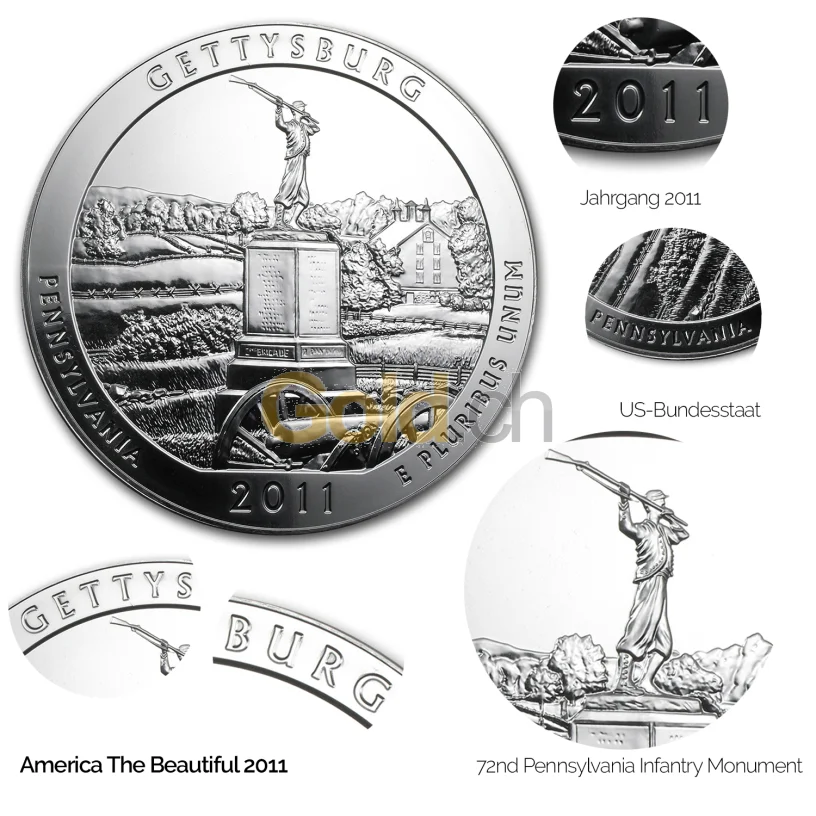 Das Monument mit dem Namen „72nd Pennsylvania Infantry Monument“ ist auf dieser Silbermünze abgebildet. Es wurde im Jahre 1891 erbaut und erinnert an die Schlacht gegen die Konföderierten. Ein Soldat der sogenannten „Fire Zouaves“, der in einer Tracht nach den Berbern (Zouaves)- die als Vorbild für den starken Kampf galten - gekleidet ist, erinnert an den entscheidenden Kampf im Amerikanischen Bürgerkrieg.