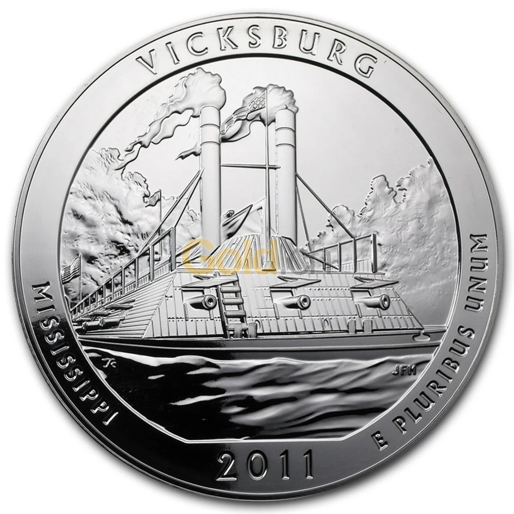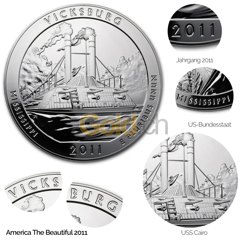Im Bundesstaat Mississippi verläuft der breite „Yazoo River“ auf dem sich die USS Cairo – ein Militärdampfschiff fortbewegt. Der Fluss zieht sich durch den „Vicksburg National Military Park“. Auf der Silbermünze nimmt die Front des Militärdampfschiffs den Großteil der Fläche ein.