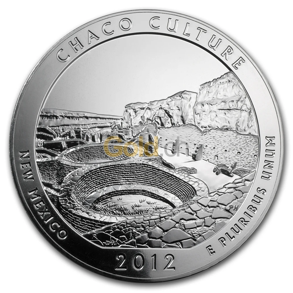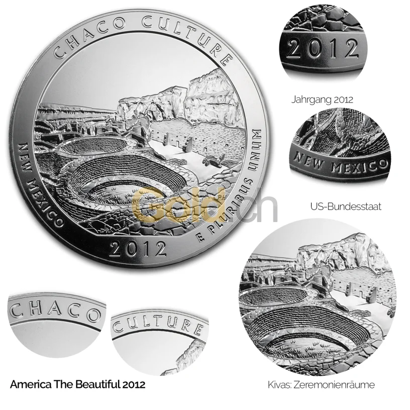 Die eindrucksvollen Gesteinsformationen in der wüsten Gegend des Bundesstaats New Mexico sind auf dieser Silbermünze abgebildet. Bei den runden Becken, die umgeben sind von Felswänden eines Canyons, handelt es sich um sogenannte Kivas. Sie sind ehemalige Bauten der Pueblo-Kulturen, den nordamerikanische Ureinwohnern, die in Dorfgemeinschaften zusammen leben.