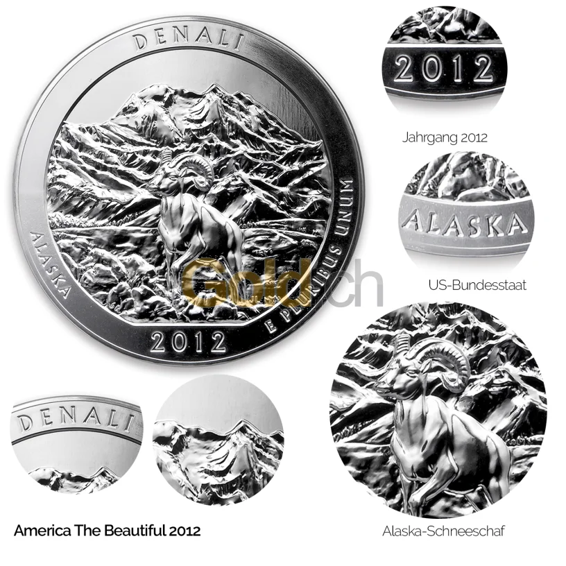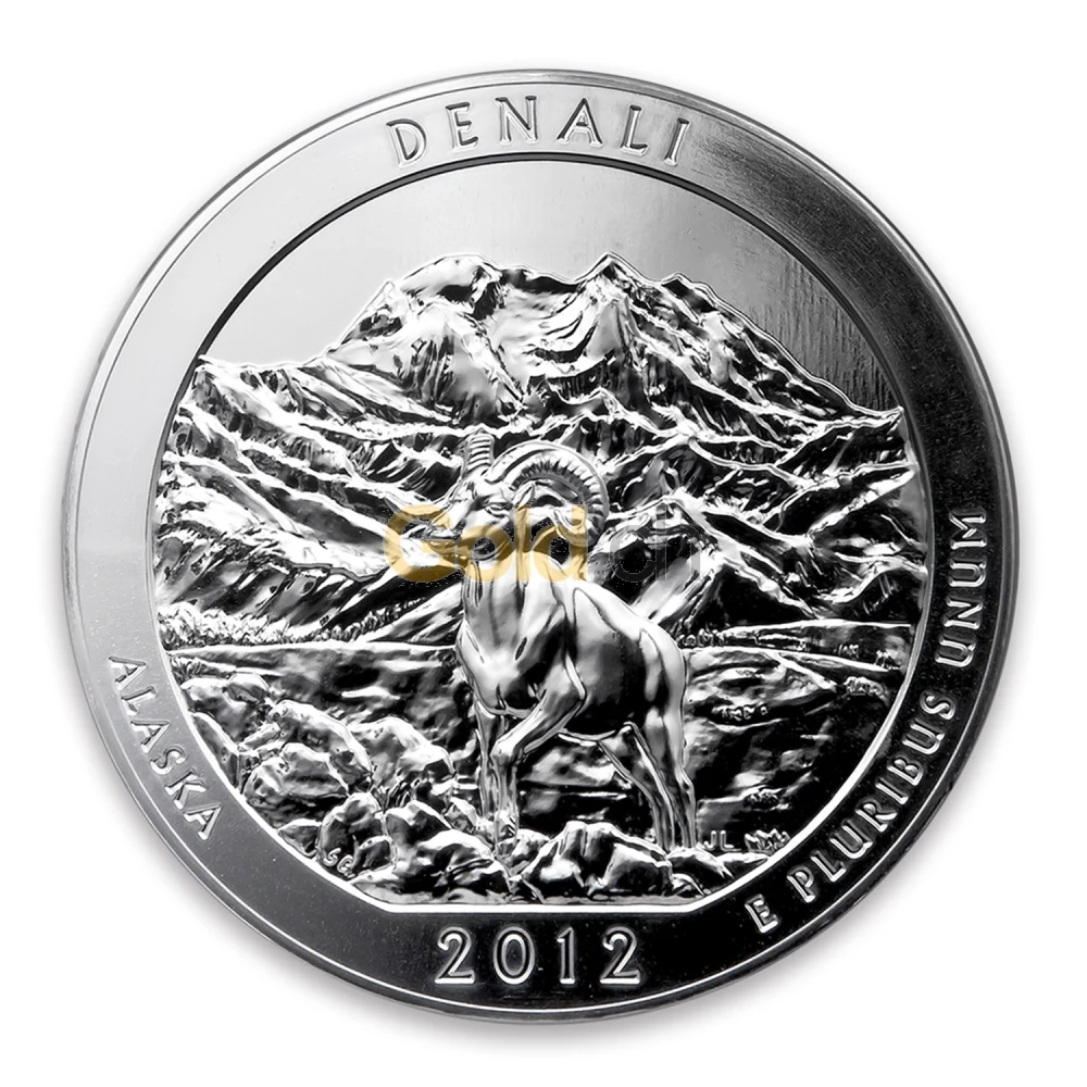 Die letzte Münze im Jahre 2012 zeigt ein Dall-Schaf (auch Alaska-Schneeschaf) vor einem kleinen Steinberg auf einer Steppe stehend. Im Hintergrund ist der Berg Denali zu sehen. Die Silbermünze ist dem Denali Nationalpark und Reservat in Alaska gewidmet.