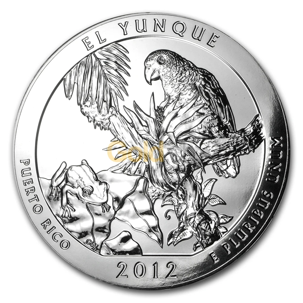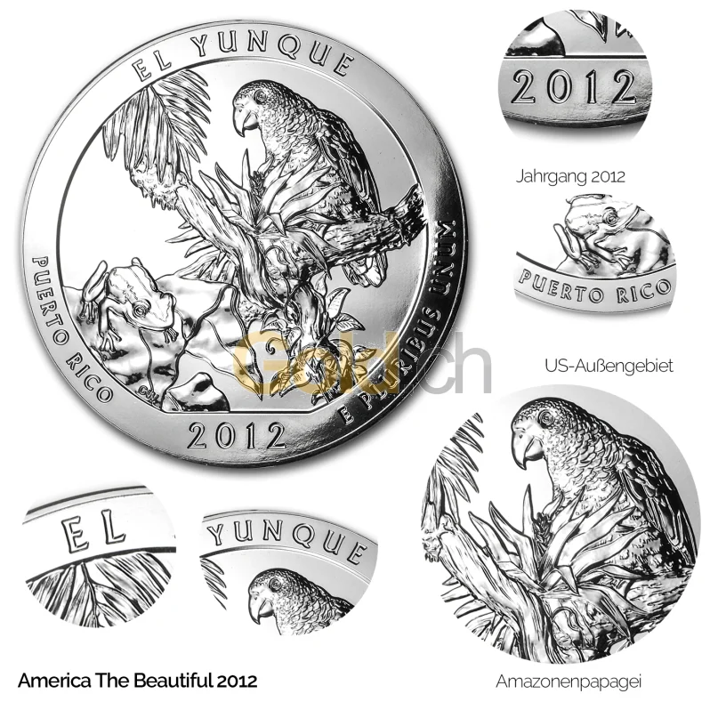 Die erste Münze im Jahre 2012 zeigt einen auf einem Ast sitzenden Papagei (Ara) der von Dschungelpflanzen umgeben ist. Im Vordergrund ist ein Baumfrosch auf einem großen Blatt zu erkennen. Diese Silbermünze ist dem US-amerikanischen Außengebiet Puerto Rico, gewidmet.