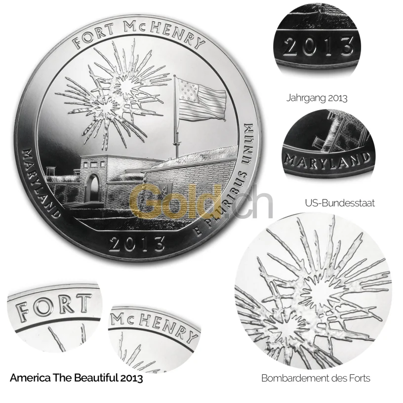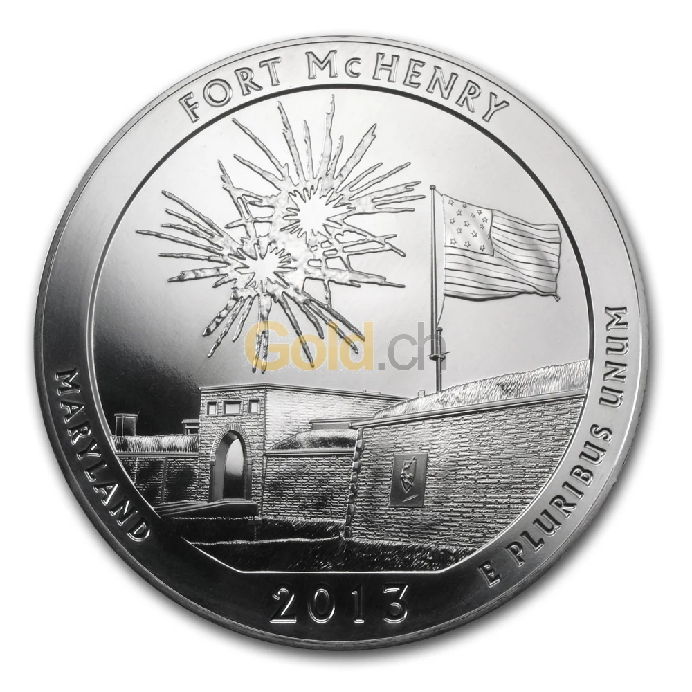 Auf der Silbermünze „Fort McHenry“ ist ein Gebäudekomplex mit einer gehissten US-amerikanischen Fahne zu sehen, über dem zwei Explosionen zu sehen sind. Es handelt sich hierbei um die Illustration des Bombardements des Forts McHenry, einem als Hexagon oder Pentagon angelegten Lagers für Schießpulver.