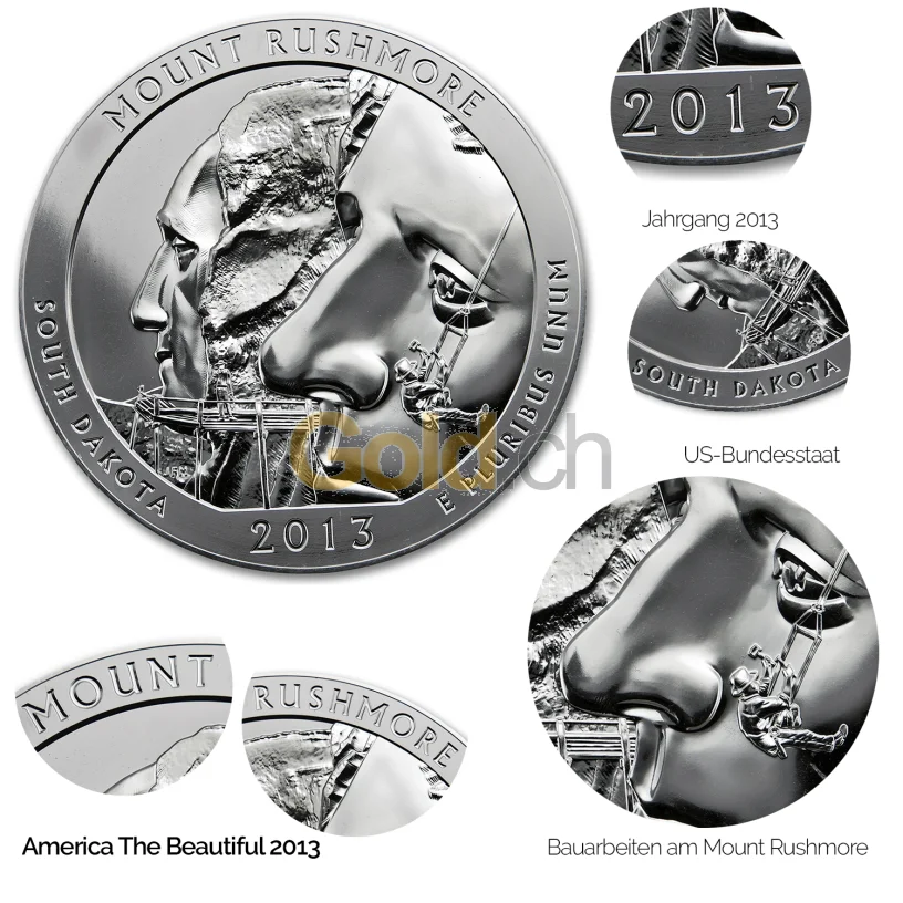 Die letzte Münze aus der 2013er Serie zeigt das weltweit bekannte Denkmal „Mount Rushmore“ in South Dakota. Zu sehen sind die in Felswände geschlagenen Profile von den Gründervätern der USA: George Washington, Thomas Jefferson, Theodore Roosevelt und Abraham Lincoln. Im Vordergrund ist ein Arbeiter, der unter dem Auge des Abbilds von Thomas Jefferson Reparaturen durchführt. Um das hintere Relief von George Washington sind Baugerüste aufgebaut.