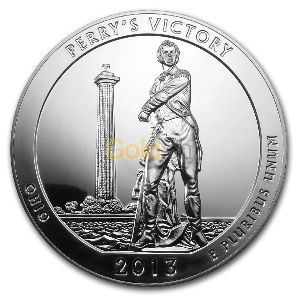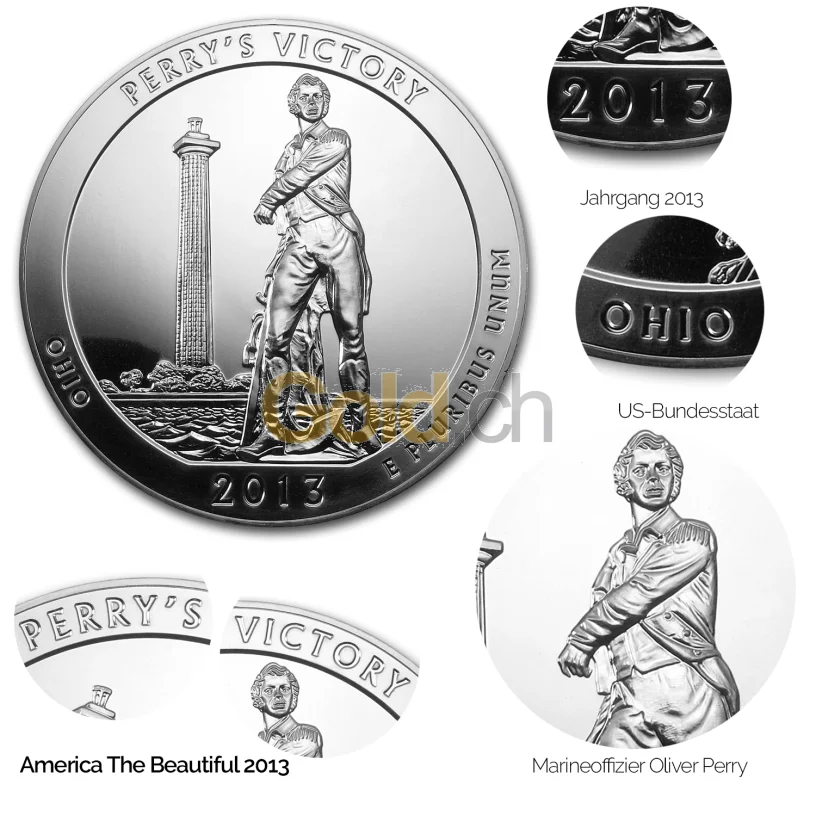 Auf dieser Silbermünze ist ein internationales Friedensdenkmal abgebildet. Im Hintergrund ist eine Säule zu sehen und im Vordergrund ist die Statue des stolz schreitenden Marineoffiziers Perry. Das Denkmal befindet sich im nordamerikanischen Bundesstaat Ohio direkt am Ort der Schlacht: dem See Erie.