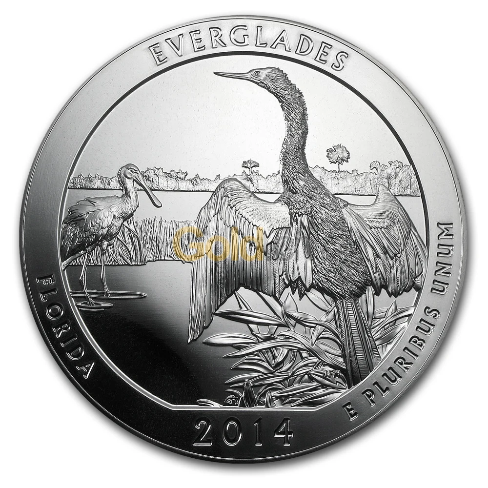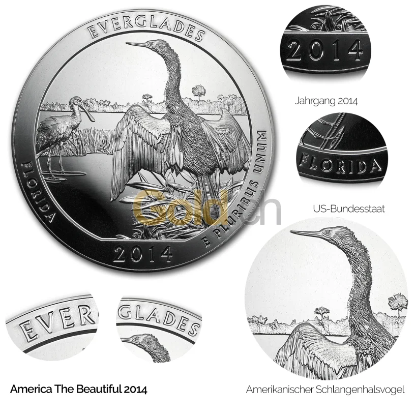 Im sonnigen Florida finden sich die sogenannten Rosalöffler, Wasservögel, die den Everglades Nationalpark bewohnen. Dort halten sie sich, wie auf der Münze zu sehen, in flachen sumpfigen Gewässern auf und waten durch das Wasser. Am Ufer im Vordergrund öffnet ein amerikanischer Schlangenhalsvogel seine Flügel, um sich von der Hitze abzukühlen.