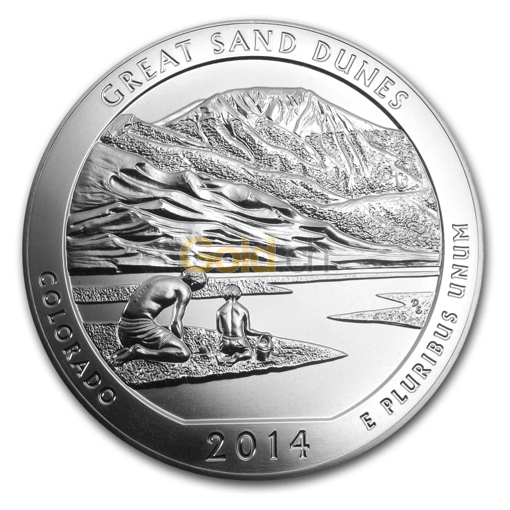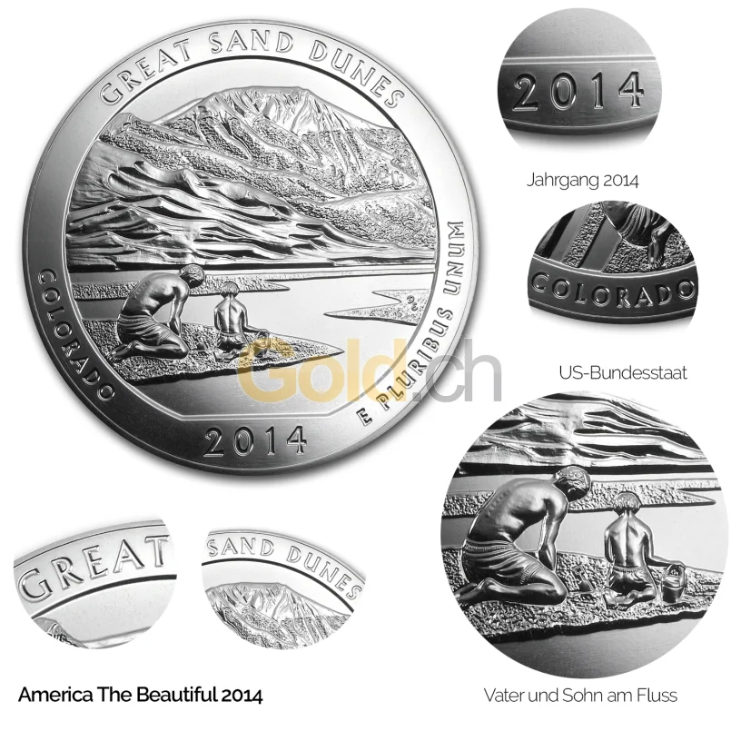 Ein Mann sitzt mit seinem Sohn an einem Flusslauf, der aus den Sanddünen im Hintergrund hervortritt. Dahinter sind die mächtigen Berge der „Sangre de Christo Mountains“ zu sehen. Diese Silbermünze zeigt den „Great Sand Dunes“-Nationalpark im zentral gelegenen Bundesstaat Colorado.