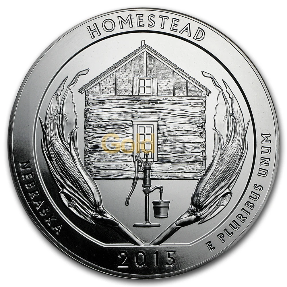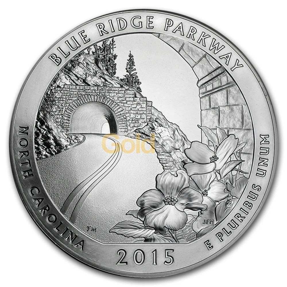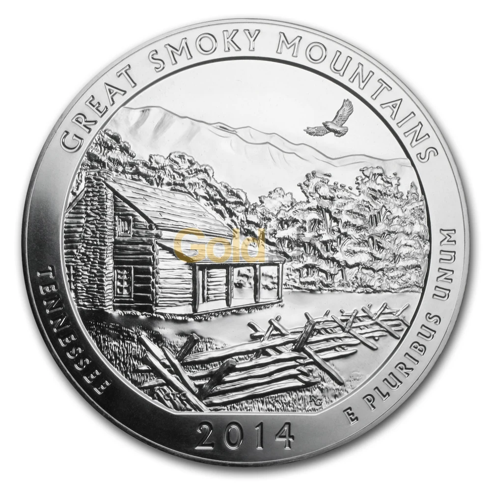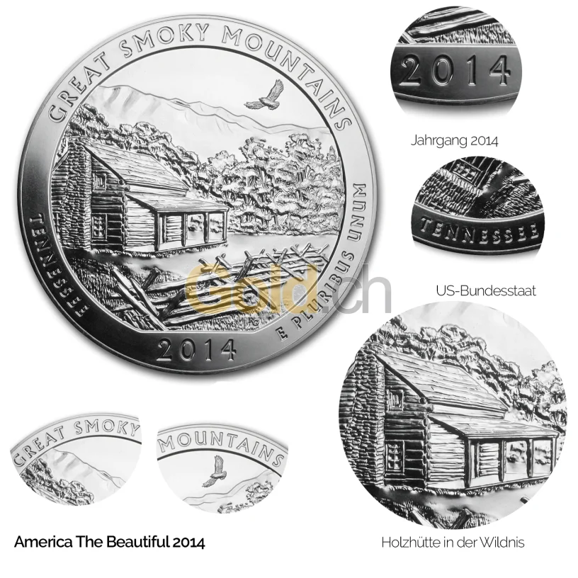 Die 21. Silbermünze zeigt den „Great Smoky Moutains“ Nationalpark im Bundesstaat Tennessee. Auf der Münze ist eine Holzhütte abgebildet, die idyllisch in der waldreichen Landschaft des Mittleren Ostens der USA liegt. Über dem Horizont schwebt ein Habicht auf der Suche nach Beute.
