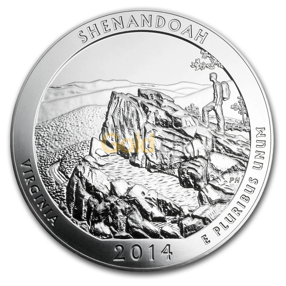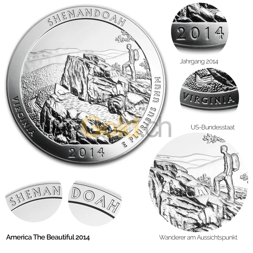 Ein Wanderer steigt auf die Spitze des Wanderwegs „Stony Man Trail“ in Virginia. Die rauen Felsen klaffen in die Höhe der sanften Landschaft. Vorsichtig tritt der Mensch auf die Anhöhe heran. Durch die hochwertige Prägung sind die Schattierungen der Felsen deutlich hervorgehoben. Diese Silbermünze ist dem im Bundesstaat Virginia gelegenem Nationalpark „Shenandoah“ gewidmet.