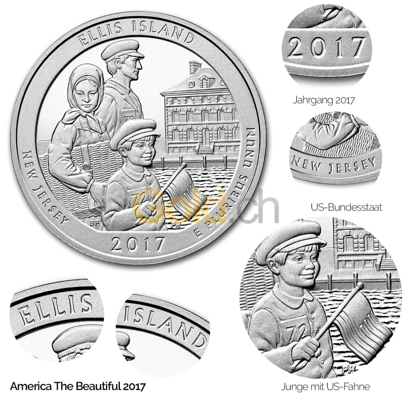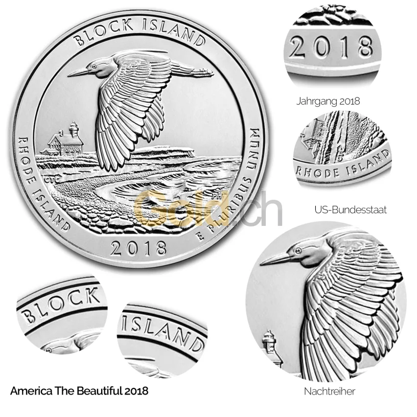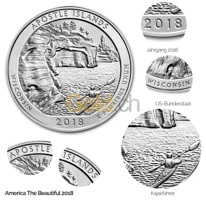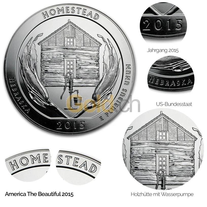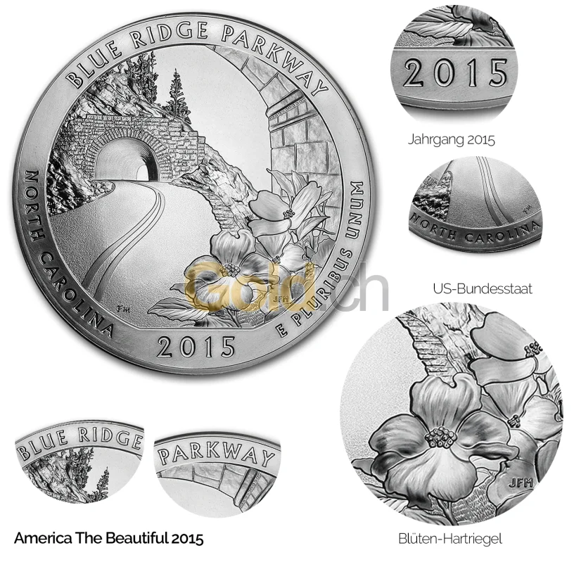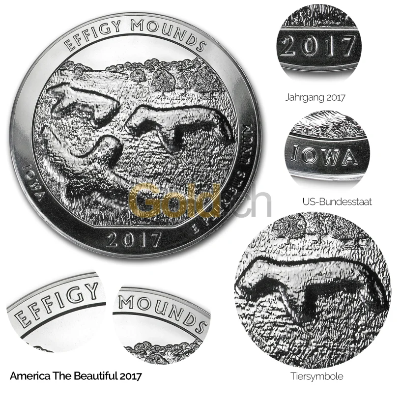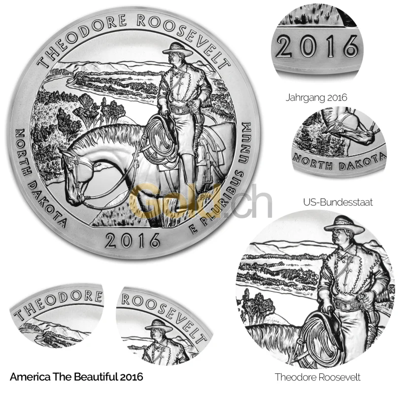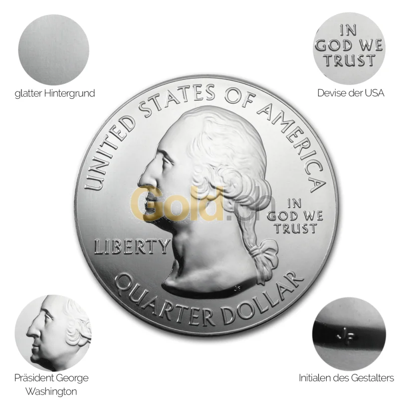 Die „America the Beautiful“-Serie präsentiert auf der Vorderseite den ersten Präsidenten der Vereinigten Staaten Amerikas, George Washington. Sein Konterfei ziert bis heute die US-amerikanischen Umlaufmünzen. Am glatten Rand der Münze verläuft die Inschrift: „.999 FINE SILVER 5.0 OUNCE“. Auf der Rückseite dieser eindrucksvollen Silbermünzen erscheint jährlich eine andere Sehenswürdigkeit der Vereinigten Staaten Amerikas.