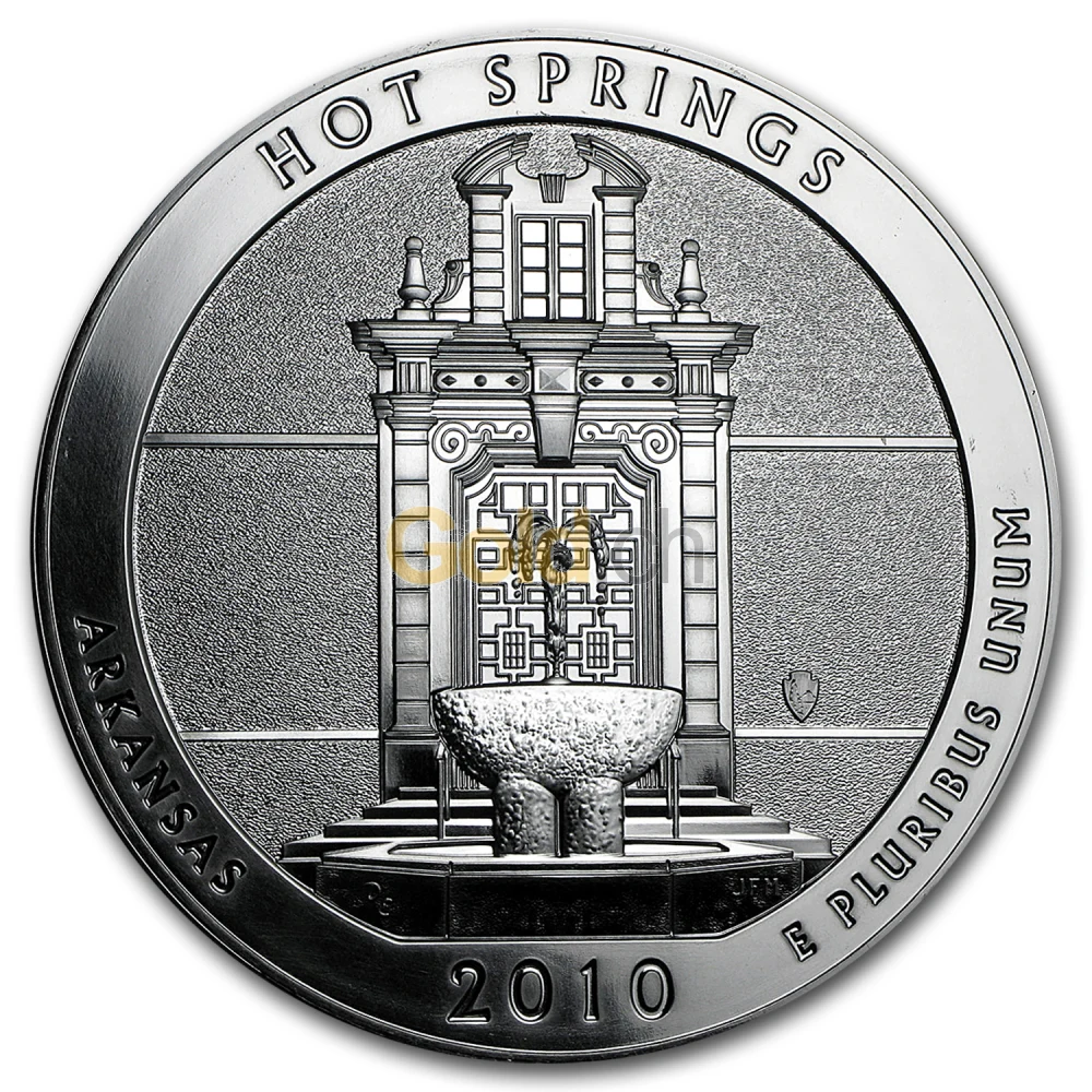 Auf der Silbermünze ist der Springbrunnen im Hauptquartier des Hot-Springs-Nationalparks in Arkansas zu sehen. Der Hintergrund der Münze ist glänzend und auf der rechten Seite ist hinter dem Brunnen ein kleines Wappen zu erkennen: das Wappen des National Park Service (dt. Nationalparkdienst). Am unteren Ende des Gebäudes stehen die Initialen „DE“ in kursiv und „JFM“.